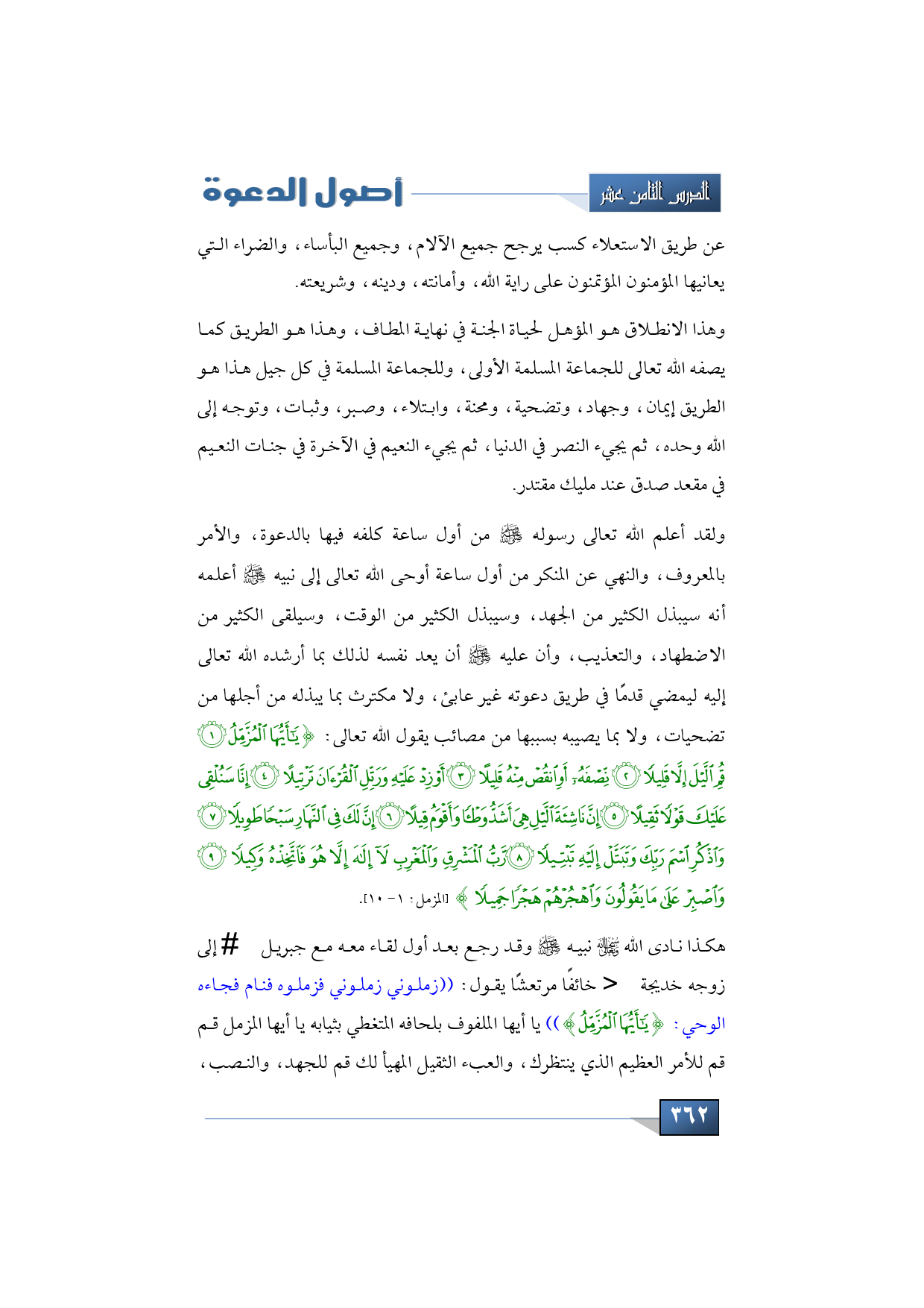 ولقد أعلم الله تعالى رسوله -صلى الله عليه وسلم- من أول ساعة كلفه فيها بالدعوة، والأمر بالمعروف، والنهي عن المنكر من أول ساعة أوحى الله تعالى إلى نبيه -صلى الله عليه وسلم- أعلمه أنه سيبذل الكثير من الجهد، وسيبذل الكثير من الوقت، وسيلقى الكثير من الاضطهاد، والتعذيب، وأن عليه -صلى الله عليه وسلم- أن يعد نفسه لذلك بما أرشده الله تعالى إليه ليمضي قدمًا في طريق دعوته غير عابئ، ولا مكترث بما يبذله من أجلها من تضحيات، ولا بما يصيبه بسببها من مصائب يقول الله تعالى: {يَا أَيُّهَا الْمُزَّمِّلُ * قُمِ اللَّيْلَ إِلَّا قَلِيلًا * نِصْفَهُ أَوِ انْقُصْ مِنْهُ قَلِيلًا * أَوْ زِدْ عَلَيْهِ وَرَتِّلِ الْقُرْآنَ تَرْتِيلًا * إِنَّا سَنُلْقِي عَلَيْكَ قَوْلًا ثَقِيلًا * إِنَّ نَاشِئَةَ اللَّيْلِ هِيَ أَشَدُّ وَطْئًا وَأَقْوَمُ قِيلًا * إِنَّ لَكَ فِي اَلنَّهَارِ سَبْحًا طَوِيلًا * وَاذْكُرِ اسْمَ رَبِّكَ وَتَبَتَّلْ إِلَيْهِ تَبْتِيلًا * رَبُّ الْمَشْرِقِ وَالْمَغْرِبِ لَا إِلَهَ إِلَّا هُوَ فَاتَّخِذْهُ وَكِيلًا * وَاصْبِرْ عَلَى مَا يَقُولُونَ وَاهْجُرْهُمْ هَجْرًا جَمِيلًا} (المزمل: 1 - 10).