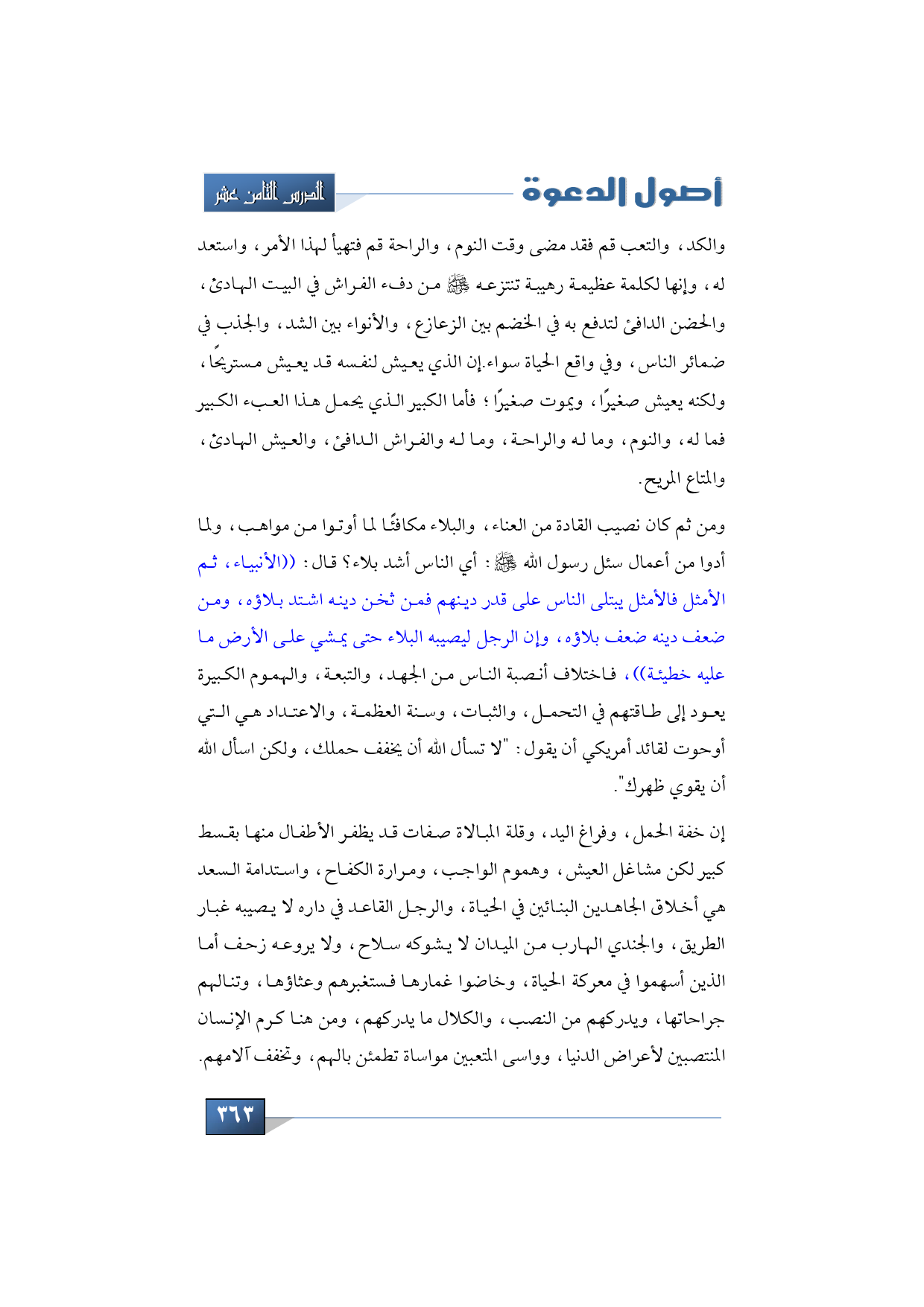 ومن ثم كان نصيب القادة من العناء، والبلاء مكافئًا لما أوتوا من مواهب، ولما أدوا من أعمال سئل رسول الله -صلى الله عليه وسلم-: أي الناس أشد بلاء؟ قال: ((الأنبياء، ثم الأمثل فالأمثل يبتلى الناس على قدر دينهم فمن ثخن دينه اشتد بلاؤه، ومن ضعف دينه ضعف بلاؤه، وإن الرجل ليصيبه البلاء حتى يمشي على الأرض ما عليه خطيئة))، فاختلاف أنصبة الناس من الجهد، والتبعة، والهموم الكبيرة يعود إلى طاقتهم في التحمل، والثبات، وسنة العظمة، والاعتداد هي التي أوحوت لقائد أمريكي أن يقول: "لا تسأل الله أن يخفف حملك، ولكن اسأل الله أن يقوي ظهرك".