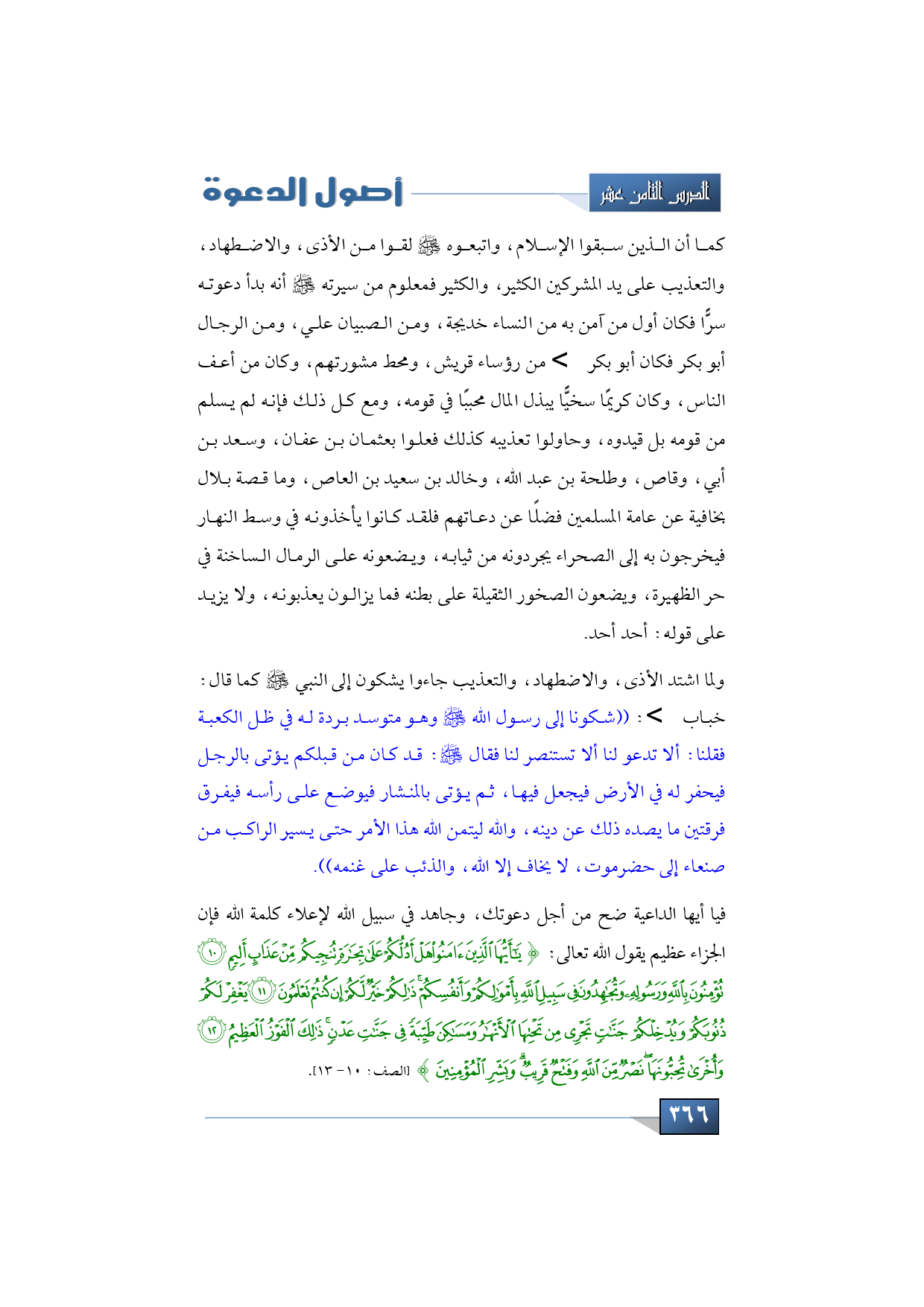 كما أن الذين سبقوا الإسلام، واتبعوه -عليه الصلاة والسلام- لقوا من الأذى، والاضطهاد، والتعذيب على يد المشركين الكثير، والكثير فمعلوم من سيرته -صلى الله عليه وسلم- أنه بدأ دعوته سرًّا فكان أول من آمن به من النساء خديجة، ومن الصبيان علي، ومن الرجال أبو بكر فكان أبو بكر -رضي الله عنه- من رؤساء قريش، ومحط مشورتهم، وكان من أعف الناس، وكان كريمًا سخيًّا يبذل المال محببًا في قومه، ومع كل ذلك فإنه لم يسلم من قومه بل قيدوه، وحاولوا تعذيبه كذلك فعلوا بعثمان بن عفان، وسعد بن أبي، وقاص، وطلحة بن عبد الله، وخالد بن سعيد بن العاص، وما قصة بلال بخافية عن عامة المسلمين فضلًا عن دعاتهم فلقد كانوا يأخذونه في وسط النهار فيخرجون به إلى الصحراء يجردونه من ثيابه، ويضعونه على الرمال الساخنة في حر الظهيرة، ويضعون الصخور الثقيلة على بطنه فما يزالون يعذبونه، ولا يزيد على قوله: أحد أحد.