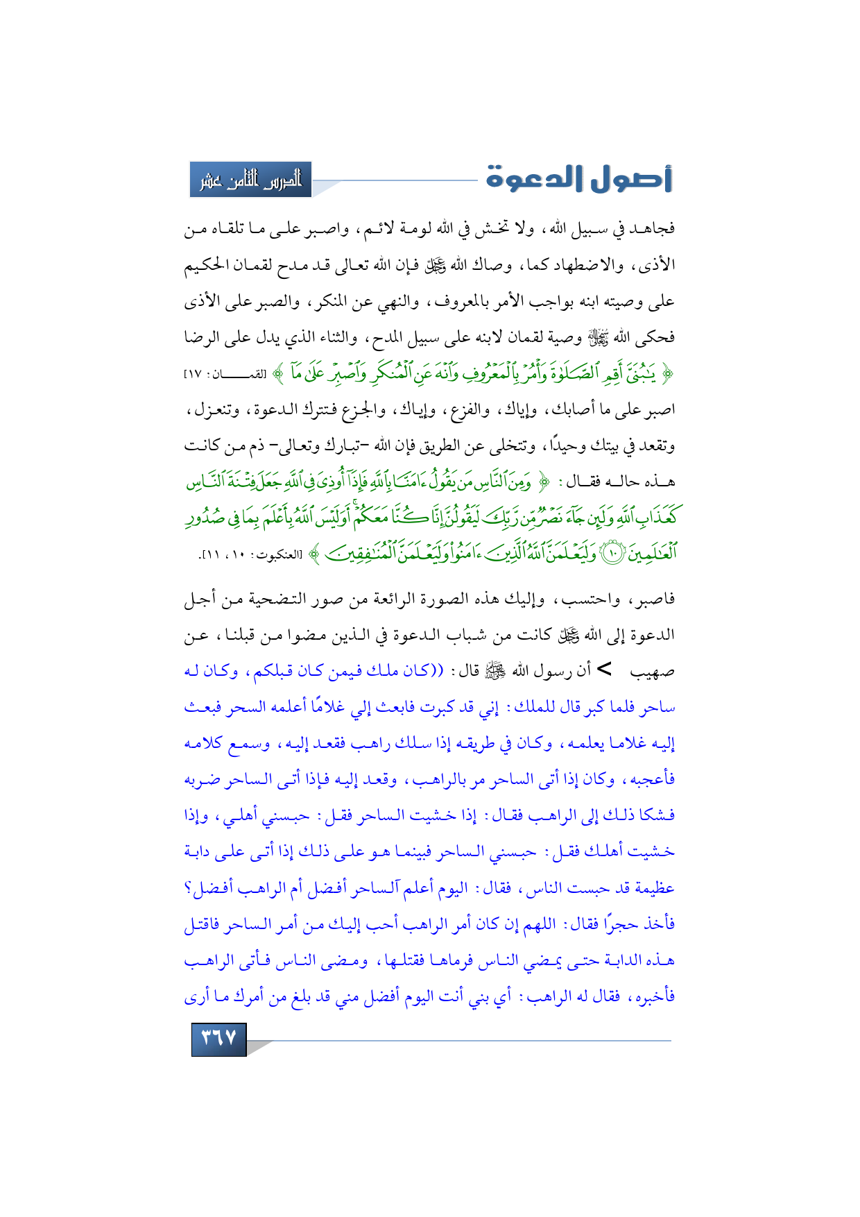 فجاهد في سبيل الله، ولا تخش في الله لومة لائم، واصبر على ما تلقاه من الأذى، والاضطهاد كما، وصاك الله -عز وجل- فإن الله تعالى قد مدح لقمان الحكيم على وصيته ابنه بواجب الأمر بالمعروف، والنهي عن المنكر، والصبر على الأذى فحكى الله -سبحانه وتعالى- وصية لقمان لابنه على سبيل المدح، والثناء الذي يدل على الرضا {يَا بُنَيَّ أَقِمِ الصَّلَاةَ وَأْمُرْ بِالْمَعْرُوفِ وَانْهَ عَنِ الْمُنْكَرِ وَاصْبِرْ عَلَى مَا أَصَابَكَ} (لقمان: 17) اصبر على ما أصابك، وإياك، والفزع، وإياك، والجزع فتترك الدعوة، وتنعزل، وتقعد في بيتك وحيدًا، وتتخلى عن الطريق فإن الله -تبارك وتعالى- ذم من كانت هذه حاله فقال: {وَمِنَ النَّاسِ مَنْ يَقُولُ آمَنَّا بِاللَّهِ فَإِذَا أُوذِيَ فِي اللَّهِ جَعَلَ فِتْنَةَ النَّاسِ كَعَذَابِ اللَّهِ وَلَئِنْ جَاءَ نَصْرٌ مِنْ رَبِّكَ لَيَقُولُنَّ إِنَّا كُنَّا مَعَكُمْ أَوَلَيْسَ اللَّهُ بِأَعْلَمَ بِمَا فِي صُدُورِ الْعَالَمِينَ * وَلَيَعْلَمَنَّ اللَّهُ الَّذِينَ آمَنُوا وَلَيَعْلَمَنَّ الْمُنَافِقِينَ} (العنكبوت: 10، 11).