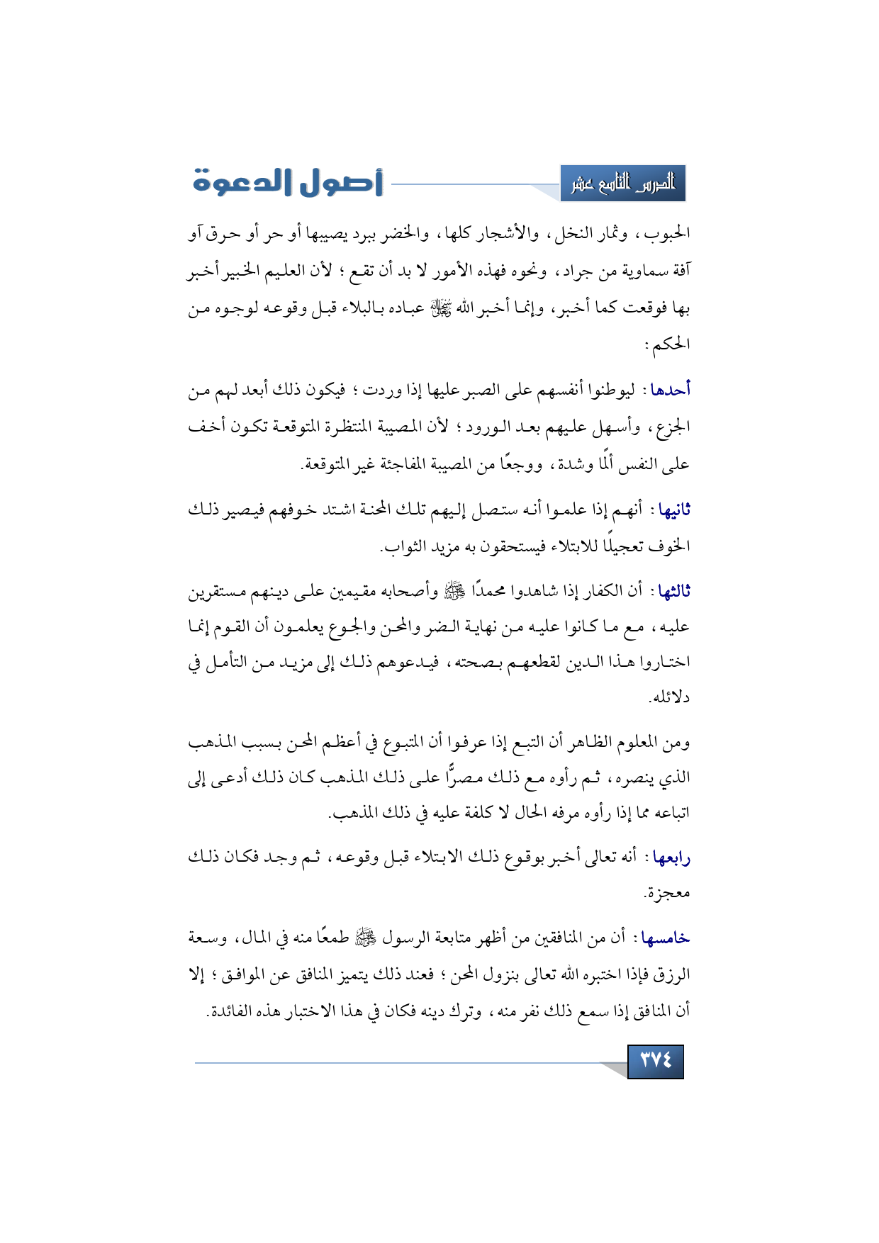 خامسها: أن من المنافقين من أظهر متابعة الرسول -صلى الله عليه وسلم- طمعًا منه في المال، وسعة الرزق فإذا اختبره الله تعالى بنزول المحن؛ فعند ذلك يتميز المنافق عن الموافق؛ إلا أن المنافق إذا سمع ذلك نفر منه، وترك دينه فكان في هذا الاختبار هذه الفائدة.