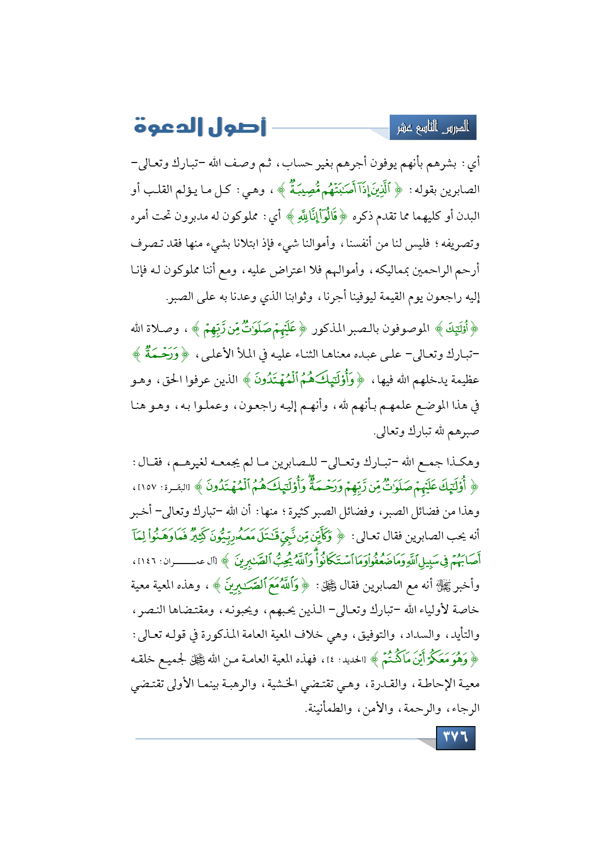 وهكذا جمع الله -تبارك وتعالى- للصابرين ما لم يجمعه لغيرهم، فقال: {أُولَئِكَ عَلَيْهِمْ صَلَوَاتٌ مِنْ رَبِّهِمْ ورَحْمَةٌ وأُولَئِكَ هُمُ الْمُهْتَدُونَ} (البقرة: 157)، وهذا من فضائل الصبر، وفضائل الصبر كثيرة؛ منها: أن الله -تبارك وتعالى- أخبر أنه يحب الصابرين فقال تعالى: {وَكَأَيِّنْ مِنْ نَبِيٍّ قَاتَلَ مَعَهُ رِبِّيُّونَ كَثِيرٌ فَمَا وهَنُوا لِمَا أَصَابَهُمْ فِي سَبِيلِ اللَّهِ ومَا ضَعُفُوا ومَا اسْتَكَانُوا واللَّهُ يُحِبُّ الصَّابِرِينَ} (آل عمران: 146)، وأخبر -سبحانه وتعالى- أنه مع الصابرين فقال عز وجل: {وَاللَّهُ مَعَ الصَّابِرِين}، وهذه المعية معية خاصة لأولياء الله -تبارك وتعالى- الذين يحبهم، ويحبونه، ومقتضاها النصر، والتأيد، والسداد، والتوفيق، وهي خلاف المعية العامة المذكورة في قوله تعالى: {وَهُوَ مَعَكُمْ أَيْنَ مَا كُنْتُمْ} (الحديد: 4)، فهذه المعية العامة من الله -عز وجل- لجميع خلقه معية الإحاطة، والقدرة، وهي تقتضي الخشية، والرهبة بينما الأولى تقتضي الرجاء، والرحمة، والأمن، والطمأنينة.