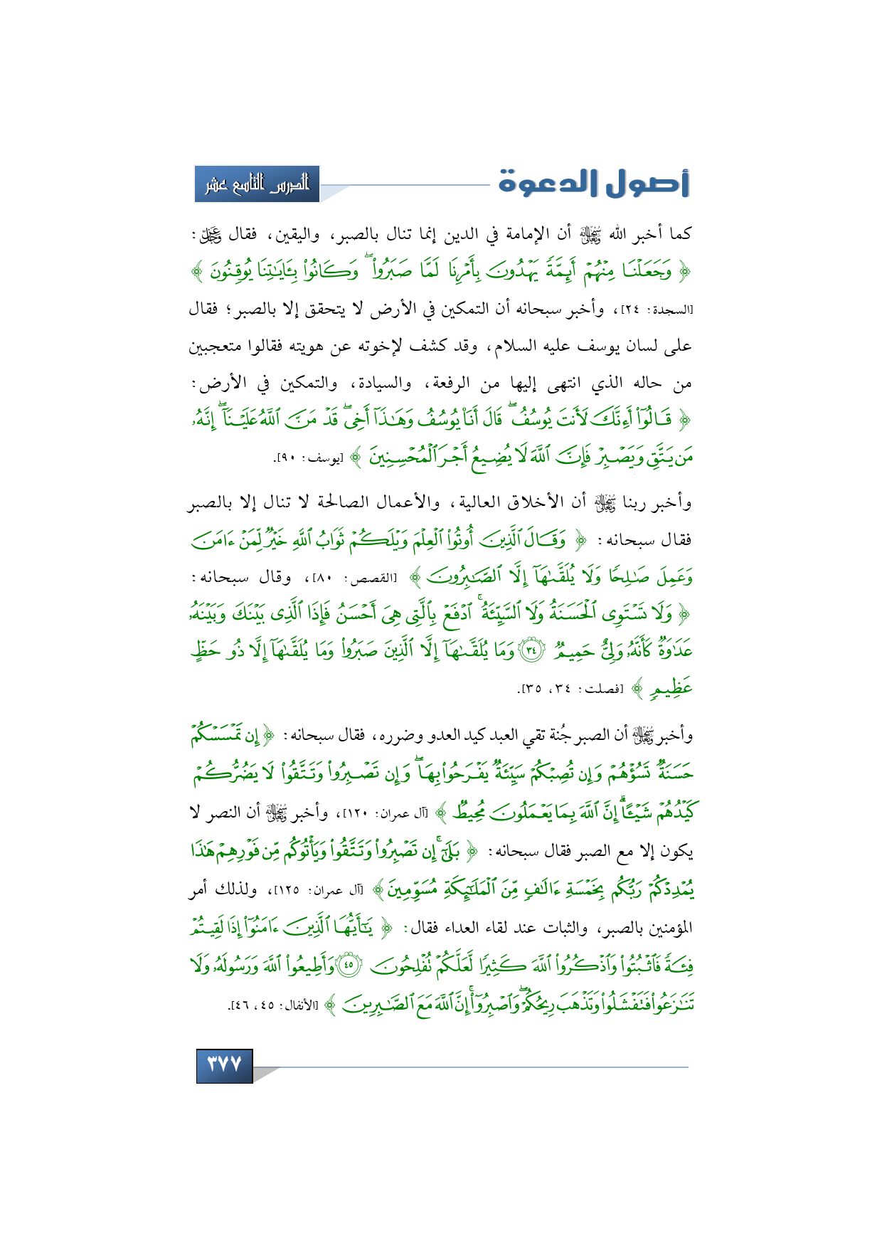 كما أخبر الله -سبحانه وتعالى- أن الإمامة في الدين إنما تنال بالصبر، واليقين، فقال -عز وجل-: {وَجَعَلْنَا مِنْهُمْ أَئِمَّةً يَهْدُونَ بِأَمْرِنَا لَمَّا صَبَرُوا وكَانُوا بِآيَاتِنَا يُوقِنُونَ} (السجدة: 24)، وأخبر سبحانه أن التمكين في الأرض لا يتحقق إلا بالصبر؛ فقال على لسان يوسف عليه السلام، وقد كشف لإخوته عن هويته فقالوا متعجبين من حاله الذي انتهى إليها من الرفعة، والسيادة، والتمكين في الأرض: {قَالُوا أَئِنَّكَ لَأَنْتَ يُوسُفُ قَالَ أَنَا يُوسُفُ وهَذَا أَخِي قَدْ مَنَّ اللَّهُ عَلَيْنَا إِنَّهُ مَنْ يَتَّقِ ويَصْبِرْ فَإِنَّ اللَّهَ لَا يُضِيعُ أَجْرَ الْمُحْسِنِينَ} (يوسف: 90).