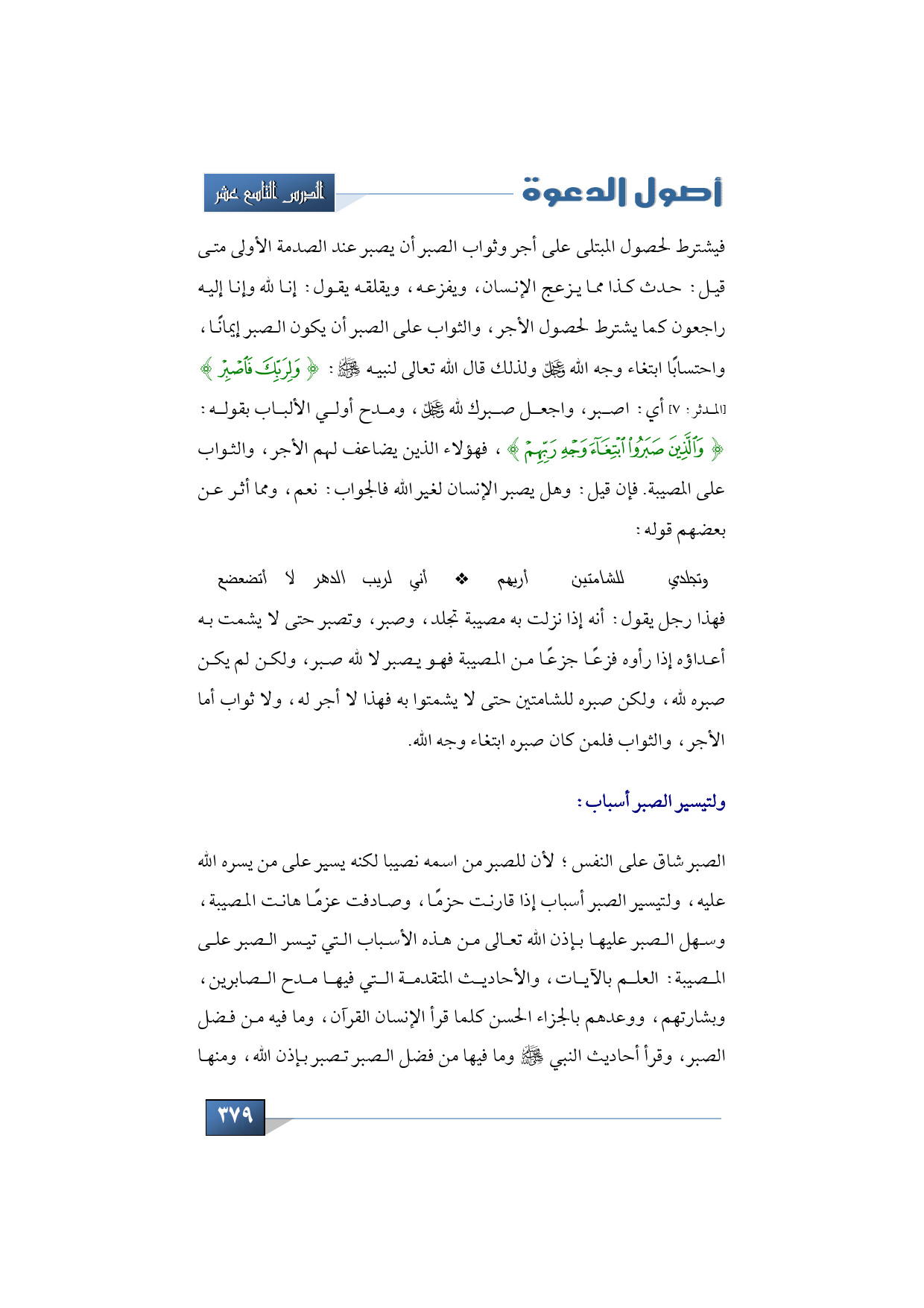 فيشترط لحصول المبتلى على أجر وثواب الصبر أن يصبر عند الصدمة الأولى متى قيل: حدث كذا مما يزعج الإنسان، ويفزعه، ويقلقه يقول: إنا لله وإنا إليه راجعون كما يشترط لحصول الأجر، والثواب على الصبر أن يكون الصبر إيمانًا، واحتسابًا ابتغاء وجه الله -عز وجل- ولذلك قال الله تعالى لنبيه -صلى الله عليه وسلم-: {وَلِرَبِّكَ فَاصْبِرْ} (المدثر: 7) أي: اصبر، واجعل صبرك لله عز وجل، ومدح أولي الألباب بقوله: {وَالَّذِينَ صَبَرُوا ابْتِغَاءَ وجْهِ رَبِّهِم}، فهؤلاء الذين يضاعف لهم الأجر، والثواب على المصيبة. فإن قيل: وهل يصبر الإنسان لغير الله فالجواب: نعم، ومما أثر عن بعضهم قوله: