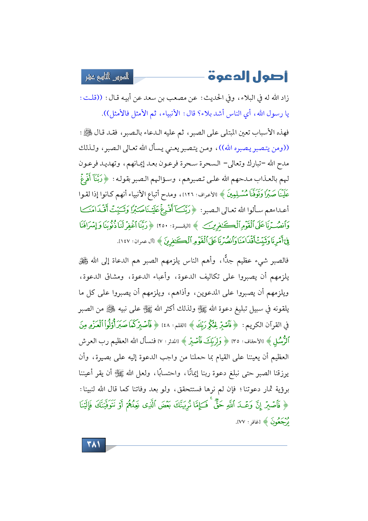 فالصبر شيء عظيم جدًّا، وأهم الناس يلزمهم الصبر هم الدعاة إلى الله -عز وجل- يلزمهم أن يصبروا على تكاليف الدعوة، وأعباء الدعوة، ومشاق الدعوة، ويلزمهم أن يصبروا على المدعوين، وأذاهم، ويلزمهم أن يصبروا على كل ما يلقونه في سبيل تبليغ دعوة الله -سبحانه وتعالى- ولذلك أكثر الله -سبحانه وتعالى- على نبيه -صلى الله عليه وسلم- من الصبر في القرآن الكريم: {فَاصْبِرْ لِحُكْمِ رَبِّكَ} (القلم: 48) {فَاصْبِرْ كَمَا صَبَرَ أولُو الْعَزْمِ مِنَ الرُّسُلِ} (الأحقاف: 35) {وَلِرَبِّكَ فَاصْبِرْ} (المدثر: 7) فنسأل الله العظيم رب العرش العظيم أن يعيننا على القيام بما حملنا من واجب الدعوة إليه على بصيرة، وأن يرزقنا الصبر حتى نبلغ دعوة ربنا إيمانًا، واحتسابًا، ولعل الله -سبحانه وتعالى- أن يقر أعيننا برؤية ثمار دعوتنا؛ فإن لم نرها فستتحقق، ولو بعد وفاتنا كما قال الله لنبينا: {فَاصْبِرْ إِنَّ وعْدَ اللَّهِ حَقٌّ فَإِمَّا نُرِيَنَّكَ بَعْضَ الَّذِي نَعِدُهُمْ أونَتَوَفَّيَنَّكَ فَإِلَيْنَا يُرْجَعُونَ} (غافر: 77).