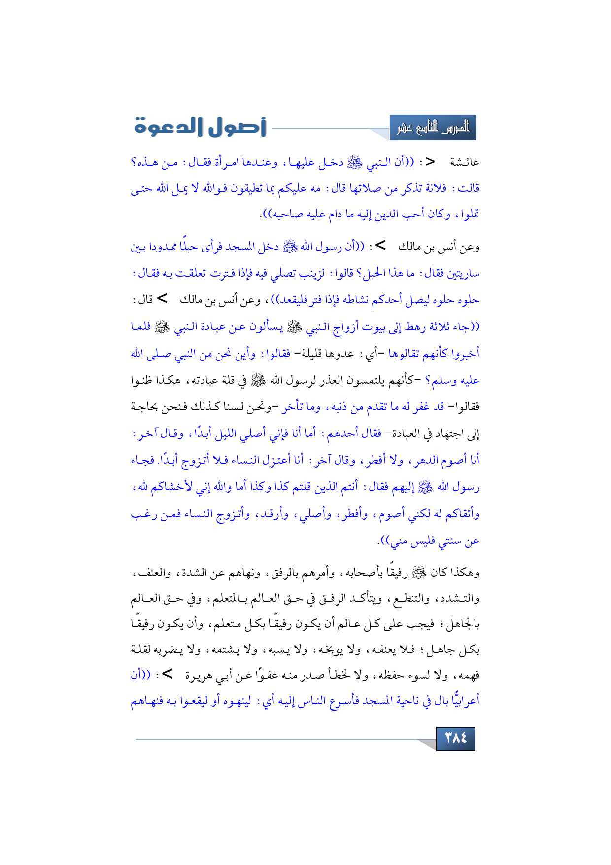 وعن أنس بن مالك -رضي الله عنه-: ((أن رسول الله -صلى الله عليه وسلم- دخل المسجد فرأى حبلًا ممدودا بين ساريتين فقال: ما هذا الحبل؟ قالوا: لزينب تصلي فيه فإذا فترت تعلقت به فقال: حلوه حلوه ليصل أحدكم نشاطه فإذا فتر فليقعد))، وعن أنس بن مالك -رضي الله عنه- قال: ((جاء ثلاثة رهط إلى بيوت أزواج النبي -صلى الله عليه وسلم يسألون عن عبادة النبي -صلى الله عليه وسلم- فلما أخبروا كأنهم تقالوها -أي: عدوها قليلة- فقالوا: وأين نحن من النبي صلى الله عليه وسلم؟ -كأنهم يلتمسون العذر لرسول الله -صلى الله عليه وسلم- في قلة عبادته، هكذا ظنوا فقالوا- قد غفر له ما تقدم من ذنبه، وما تأخر -ونحن لسنا كذلك فنحن بحاجة إلى اجتهاد في العبادة- فقال أحدهم: أما أنا فإني أصلي الليل أبدًا، وقال آخر: أنا أصوم الدهر، ولا أفطر، وقال آخر: أنا أعتزل النساء فلا أتزوج أبدًا. فجاء رسول الله -صلى الله عليه وسلم- إليهم فقال: أنتم الذين قلتم كذا وكذا أما والله إني لأخشاكم لله، وأتقاكم له لكني أصوم، وأفطر، وأصلي، وأرقد، وأتزوج النساء فمن رغب عن سنتي فليس مني)).