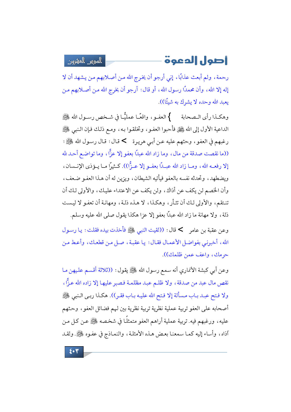 وعن أبي كبشة الأنماري أنه سمع رسول الله -صلى الله عليه وسلم- يقول: ((ثلاثة أقسم عليهن ما نقص مال عبد من صدقة، ولا ظلم عبد مظلمة فصبر عليها إلا زاده الله عزًّا، ولا فتح عبد باب مسألة إلا فتح الله عليه باب فقر)). هكذا ربى النبي -صلى الله عليه، وسلم- أصحابه على العفو تربية عملية نظرية تربية نظرية بين لهم فضائل العفو، وحثهم عليه، ورغبهم فيه. تربية عملية أراهم العفو متمثلًا في شخصه -صلى الله عليه وسلم- عن كل من آذاه، وأساء إليه كما سمعنا بعض هذه الأمثلة، والنماذج في عفوه -صلى الله عليه وسلم. ولقد