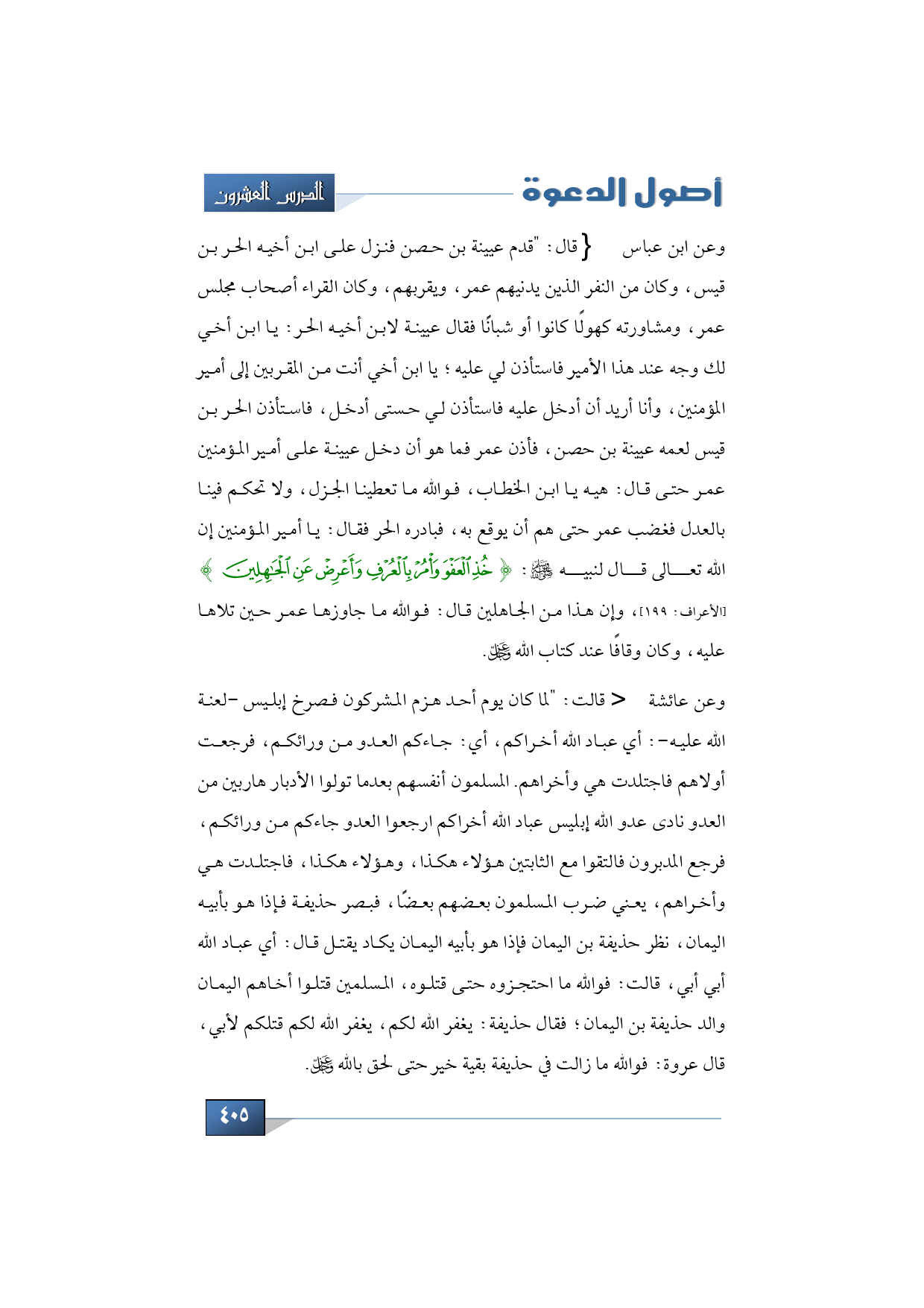 وعن ابن عباس -رضي الله عنهما- قال: "قدم عيينة بن حصن فنزل على ابن أخيه الحر بن قيس، وكان من النفر الذين يدنيهم عمر، ويقربهم، وكان القراء أصحاب مجلس عمر، ومشاورته كهولًا كانوا أو شبانًا فقال عيينة لابن أخيه الحر: يا ابن أخي لك وجه عند هذا الأمير فاستأذن لي عليه؛ يا ابن أخي أنت من المقربين إلى أمير المؤمنين، وأنا أريد أن أدخل عليه فاستأذن لي حستى أدخل، فاستأذن الحر بن قيس لعمه عيينة بن حصن، فأذن عمر فما هو أن دخل عيينة على أمير المؤمنين عمر حتى قال: هيه يا ابن الخطاب، فوالله ما تعطينا الجزل، ولا تحكم فينا بالعدل فغضب عمر حتى هم أن يوقع به، فبادره الحر فقال: يا أمير المؤمنين إن الله تعالى قال لنبيه -صلى الله عليه وسلم-: {خُذِ الْعَفْوَ وأْمُرْ بِالْعُرْفِ وأَعْرِضْ عَنِ الْجَاهِلِينَ} (الأعراف: 199)، وإن هذا من الجاهلين قال: فوالله ما جاوزها عمر حين تلاها عليه، وكان وقافًا عند كتاب الله عز وجل.