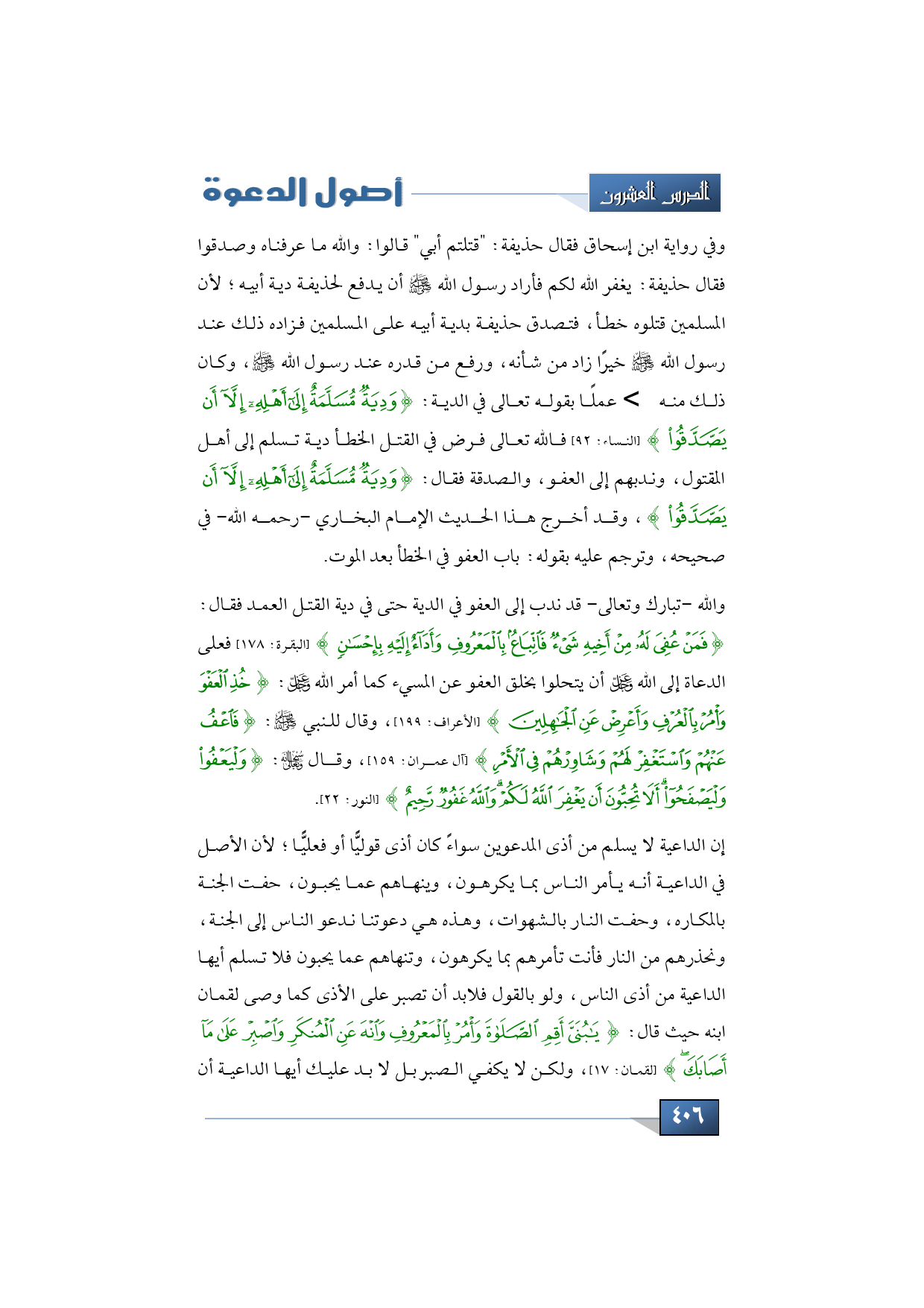 والله -تبارك وتعالى- قد ندب إلى العفو في الدية حتى في دية القتل العمد فقال: {فَمَنْ عُفِيَ لَهُ مِنْ أَخِيهِ شَيْءٌ فَاتِّبَاعٌ بِالْمَعْرُوفِ وأَدَاءٌ إِلَيْهِ بِإِحْسَانٍ} (البقرة: 178) فعلى الدعاة إلى الله -عز وجل- أن يتحلوا بخلق العفو عن المسيء كما أمر الله -عز وجل-: {خُذِ الْعَفْوَ وأْمُرْ بِالْعُرْفِ وأَعْرِضْ عَنِ الْجَاهِلِينَ} (الأعراف: 199)، وقال للنبي -صلى الله عليه وسلم-: {فَاعْفُ عَنْهُمْ واسْتَغْفِرْ لَهُمْ وشَاوِرْهُمْ فِي الْأَمْرِ} (آل عمران: 159)، وقال -سبحانه وتعالى-: {وَلْيَعْفُوا ولْيَصْفَحُوا أَلَا تُحِبُّونَ أَنْ يَغْفِرَ اللَّهُ لَكُمْ واللَّهُ غَفُورٌ رَحِيمٌ} (النور: 22).