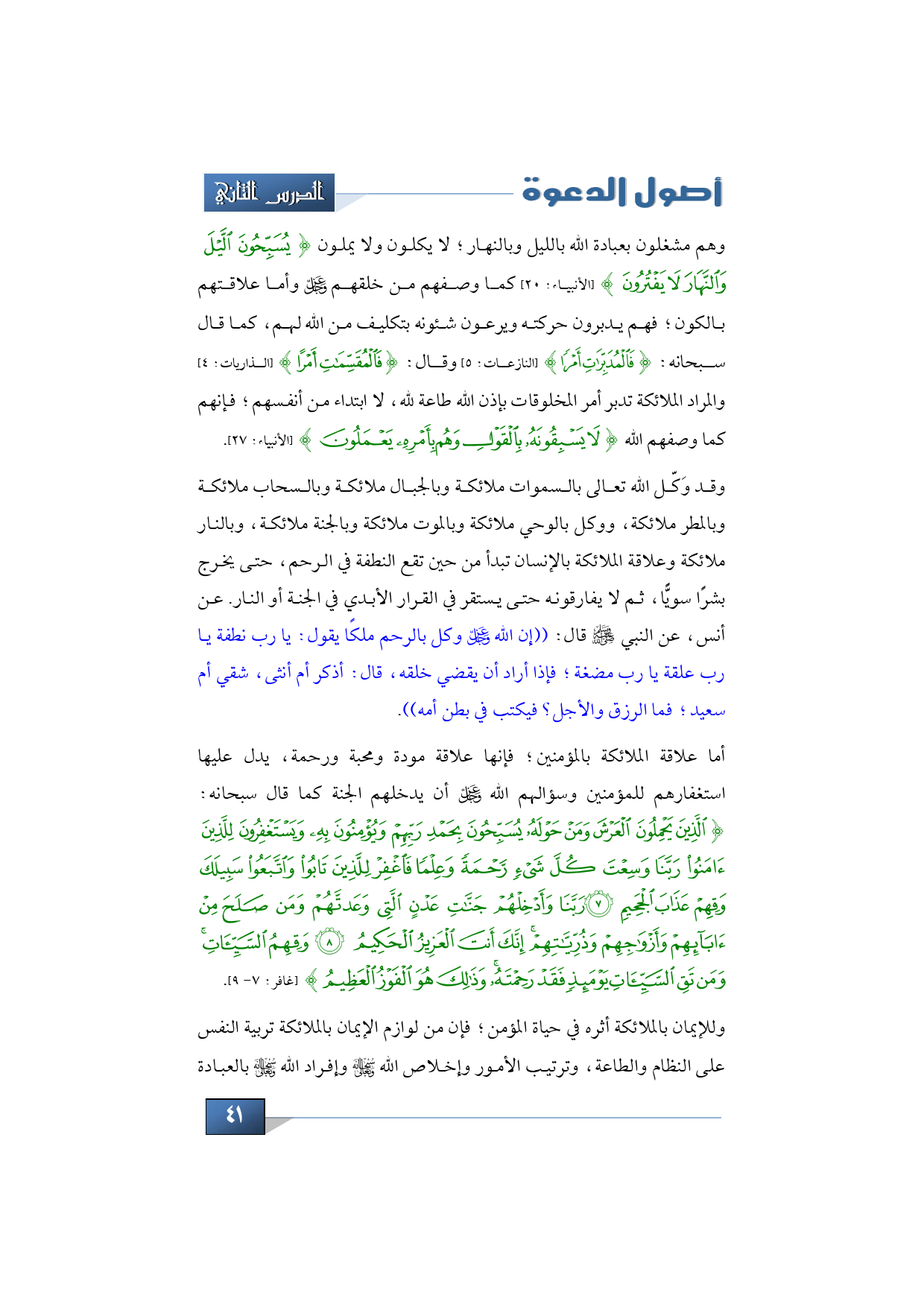 وهم مشغلون بعبادة الله بالليل وبالنهار؛ لا يكلون ولا يملون {يُسَبِّحُونَ اللَّيْلَ وَالنَّهَارَ لا يَفْتُرُونَ} (الأنبياء: 20) كما وصفهم من خلقهم -سبحانه وتعالى- وأما علاقتهم بالكون؛ فهم يدبرون حركته ويرعون شئونه بتكليف من الله لهم، كما قال سبحانه: {فَالْمُدَبِّرَاتِ أَمْرًا} (النازعات: 5) وقال: {فَالْمُقَسِّمَاتِ أَمْرًا} (الذاريات: 4) والمراد الملائكة تدبر أمر المخلوقات بإذن الله طاعة لله، لا ابتداء من أنفسهم؛ فإنهم كما وصفهم الله {لا يَسْبِقُونَهُ بِالْقَوْلِ وَهُمْ بِأَمْرِهِ يَعْمَلُون} (الأنبياء: 27).