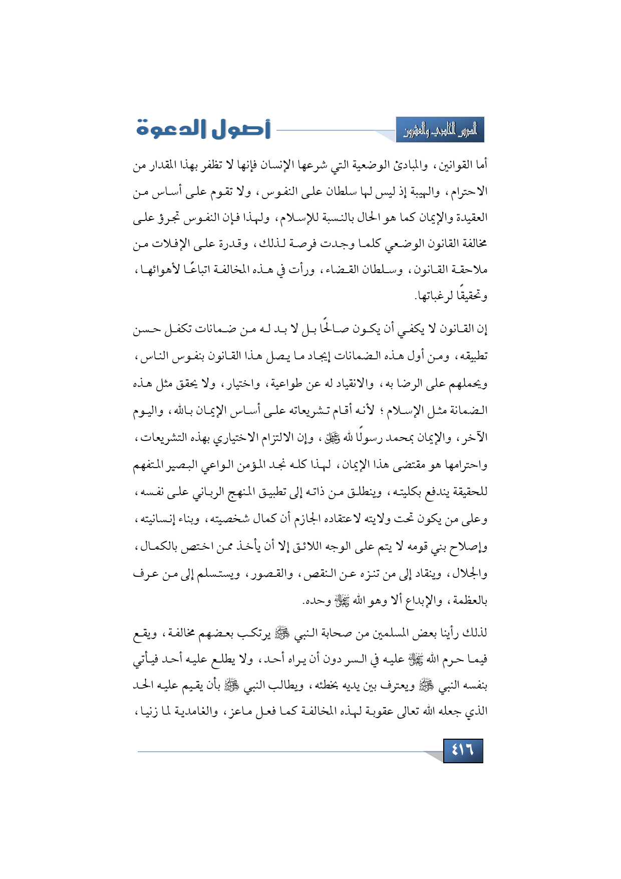 إن القانون لا يكفي أن يكون صالحًا بل لا بد له من ضمانات تكفل حسن تطبيقه، ومن أول هذه الضمانات إيجاد ما يصل هذا القانون بنفوس الناس، ويحملهم على الرضا به، والانقياد له عن طواعية، واختيار، ولا يحقق مثل هذه الضمانة مثل الإسلام؛ لأنه أقام تشريعاته على أساس الإيمان بالله، واليوم الآخر، والإيمان بمحمد رسولًا لله عز وجل، وإن الالتزام الاختياري بهذه التشريعات، واحترامها هو مقتضى هذا الإيمان، لهذا كله نجد المؤمن الواعي البصير المتفهم للحقيقة يندفع بكليته، وينطلق من ذاته إلى تطبيق المنهج الرباني على نفسه، وعلى من يكون تحت ولايته لاعتقاده الجازم أن كمال شخصيته، وبناء إنسانيته، وإصلاح بني قومه لا يتم على الوجه اللائق إلا أن يأخذ ممن اختص بالكمال، والجلال، وينقاد إلى من تنزه عن النقص، والقصور، ويستسلم إلى من عرف بالعظمة، والإبداع ألا وهو الله -سبحانه وتعالى- وحده.