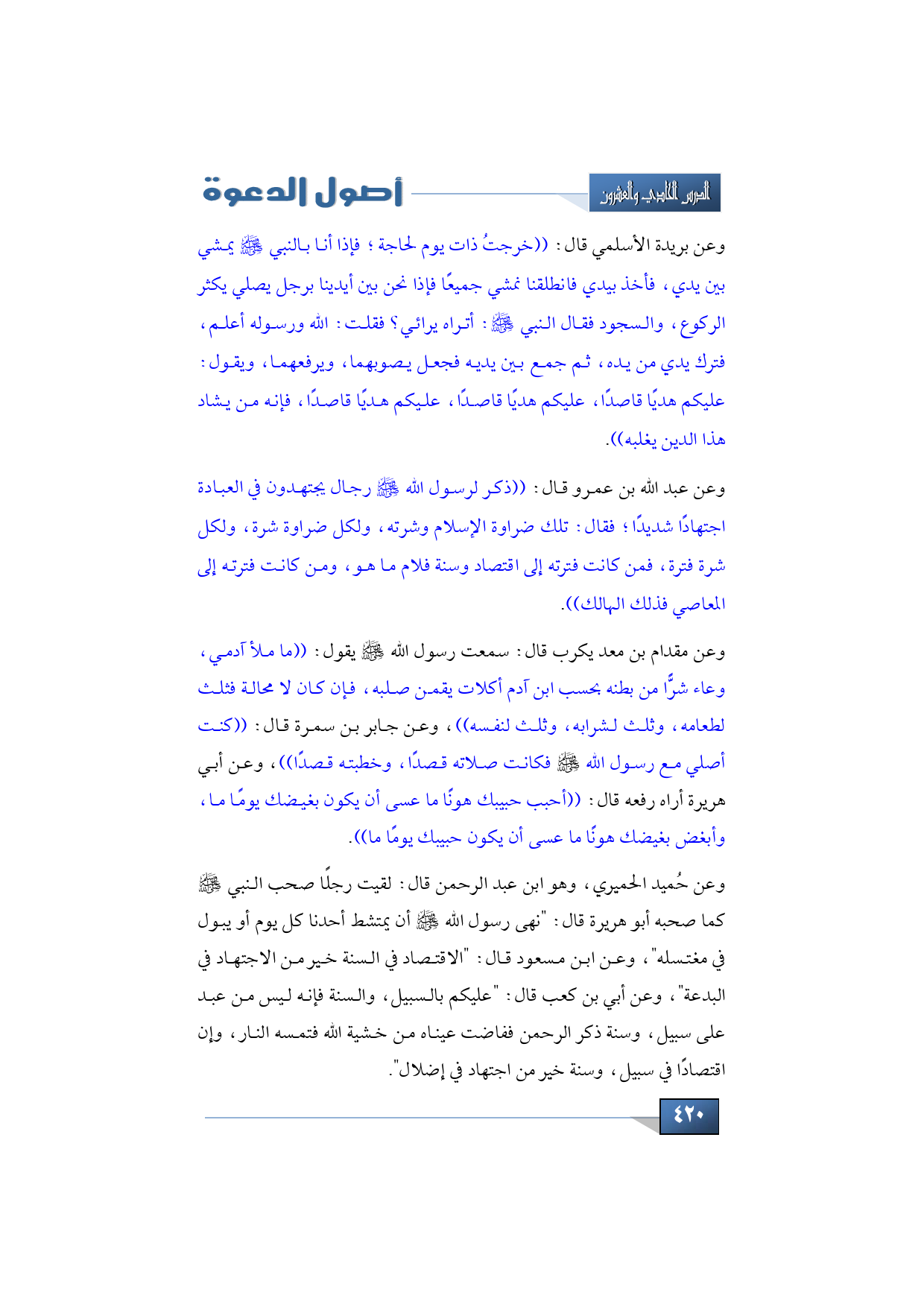 وعن بريدة الأسلمي قال: ((خرجتُ ذات يوم لحاجة؛ فإذا أنا بالنبي -صلى الله عليه وسلم- يمشي بين يدي، فأخذ بيدي فانطلقنا نمشي جميعًا فإذا نحن بين أيدينا برجل يصلي يكثر الركوع، والسجود فقال النبي -صلى الله عليه وسلم-: أتراه يرائي؟ فقلت: الله ورسوله أعلم، فترك يدي من يده، ثم جمع بين يديه فجعل يصوبهما، ويرفعهما، ويقول: عليكم هديًا قاصدًا، عليكم هديًا قاصدًا، عليكم هديًا قاصدًا، فإنه من يشاد هذا الدين يغلبه)).
