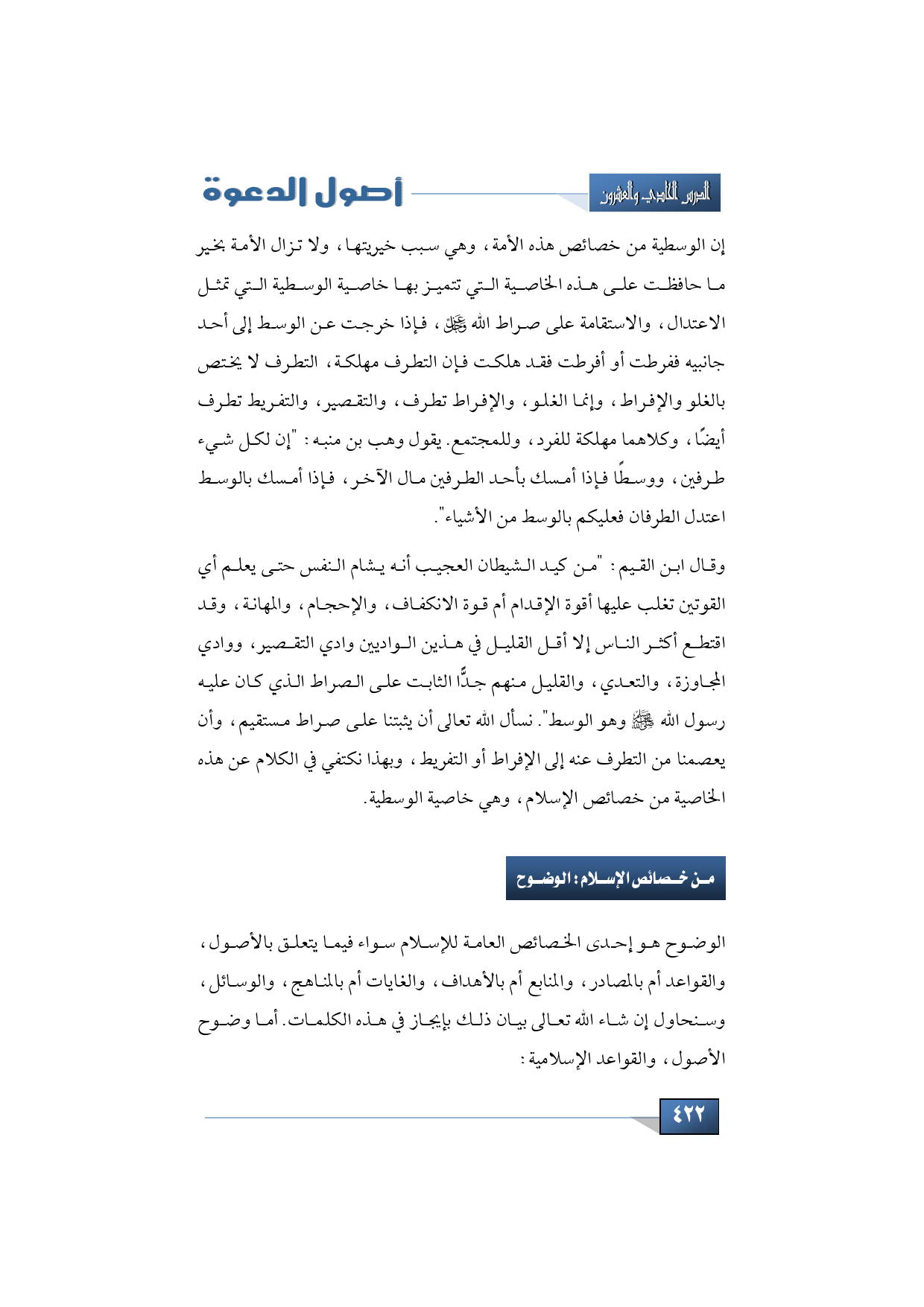 وقال ابن القيم: "من كيد الشيطان العجيب أنه يشام النفس حتى يعلم أي القوتين تغلب عليها أقوة الإقدام أم قوة الانكفاف، والإحجام، والمهانة، وقد اقتطع أكثر الناس إلا أقل القليل في هذين الواديين وادي التقصير، ووادي المجاوزة، والتعدي، والقليل منهم جدًّا الثابت على الصراط الذي كان عليه رسول الله -صلى الله عليه وسلم- وهو الوسط". نسأل الله تعالى أن يثبتنا على صراط مستقيم، وأن يعصمنا من التطرف عنه إلى الإفراط أو التفريط، وبهذا نكتفي في الكلام عن هذه الخاصية من خصائص الإسلام، وهي خاصية الوسطية.