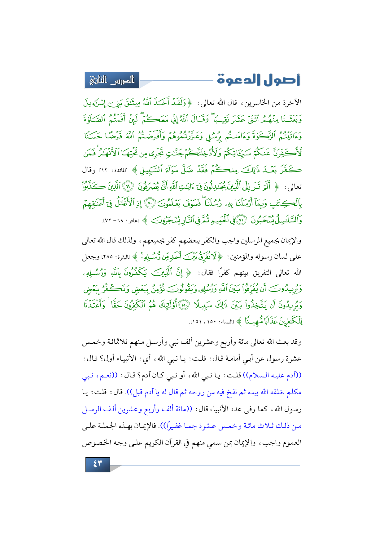 وقد بعث الله تعالى مائة وأربع وعشرين ألف نبي وأرسل منهم ثلاثمائة وخمس عشرة رسول عن أبي أمامة قال: قلت: يا نبي الله، أي: الأنبياء أول؟ قال: ((آدم عليه السلام)) قلت: يا نبي الله، أو نبي كان آدم؟ قال: ((نعم، نبي مكلم خلقه الله بيده ثم نفخ فيه من روحه ثم قال له يا آدم قبل)). قال: قلت: يا رسول الله، كما وفى عدد الأنبياء قال: ((مائة ألف وأربع وعشرين ألف الرسل من ذلك ثلاث مائة وخمس عشرة جما غفيرًا)). فالإيمان بهذه الجملة على العموم واجب، والإيمان بمن سمي منهم في القرآن الكريم على وجه الخصوص