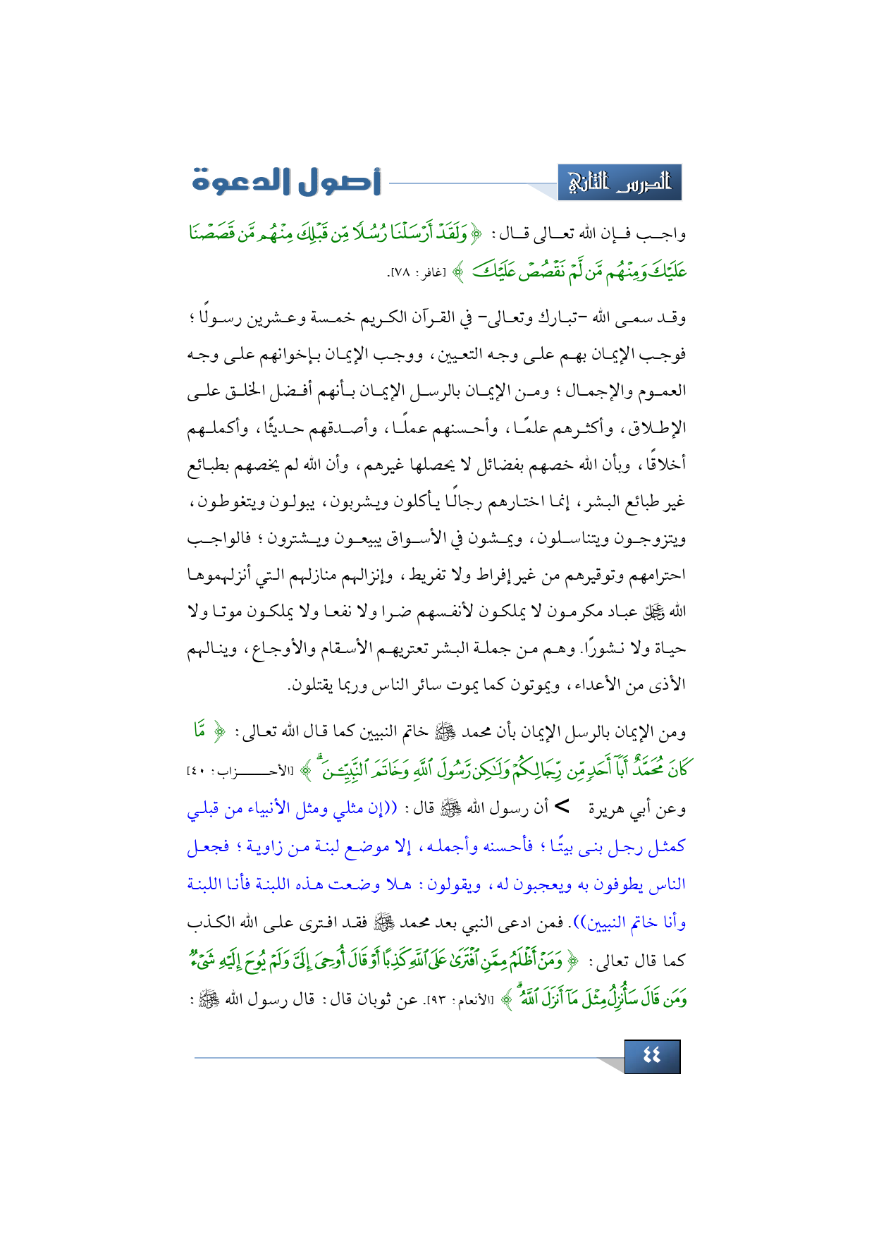 ومن الإيمان بالرسل الإيمان بأن محمد -صلى الله عليه وسلم- خاتم النبيين كما قال الله تعالى: {مَا كَانَ مُحَمَّدٌ أَبَا أَحَدٍ مِنْ رِجَالِكُمْ وَلَكِنْ رَسُولَ اللَّهِ وَخَاتَمَ النَّبِيِّينَ} (الأحزاب: 40) وعن أبي هريرة -رضي الله عنه- أن رسول الله -صلى الله عليه وسلم- قال: ((إن مثلي ومثل الأنبياء من قبلي كمثل رجل بنى بيتًا؛ فأحسنه وأجمله، إلا موضع لبنة من زاوية؛ فجعل الناس يطوفون به ويعجبون له، ويقولون: هلا وضعت هذه اللبنة فأنا اللبنة وأنا خاتم النبيين)). فمن ادعى النبي بعد محمد -صلى الله عليه وسلم- فقد افترى على الله الكذب كما قال تعالى: {وَمَنْ أَظْلَمُ مِمَّنِ افْتَرَى عَلَى اللَّهِ كَذِبًا أَوْ قَالَ أُوحِيَ إِلَيَّ وَلَمْ يُوحَ إِلَيْهِ شَيْءٌ وَمَنْ قَالَ سَأُنْزِلُ مِثْلَ مَا أَنْزَلَ اللَّهُ} (الأنعام: 93). عن ثوبان قال: قال رسول الله -صلى الله عليه وسلم-: