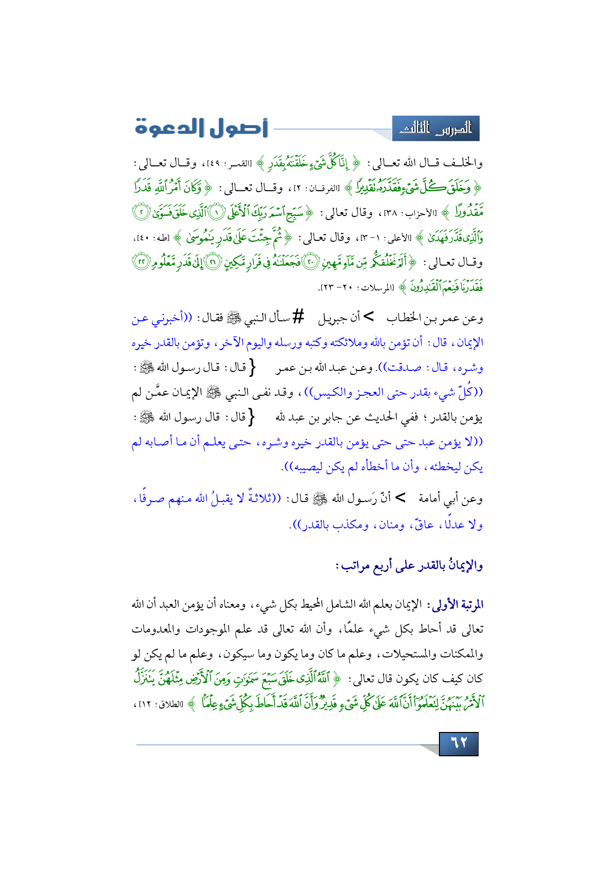وعن عمر بن الخطاب -رضي الله عنه- أن جبريل -عليه السلام- سأل النبي -صلى الله عليه وسلم- فقال: ((أخبرني عن الإيمان، قال: أن تؤمن بالله وملائكته وكتبه ورسله واليوم الآخر، وتؤمن بالقدر خيره وشره، قال: صدقت)). وعن عبد الله بن عمر -رضي الله عنهما- قال: قال رسول الله -صلى الله عليه وسلم-: ((كُلّ شيء بقدر حتى العجز والكيس))، وقد نفى النبي -صلى الله عليه وسلم- الإيمان عمَّن لم يؤمن بالقدر؛ ففي الحديث عن جابر بن عبد لله -رضي الله عنهما- قال: قال رسول الله -صلى الله عليه وسلم-: ((لا يؤمن عبد حتى حتى يؤمن بالقدر خيره وشره، حتى يعلم أن ما أصابه لم يكن ليخطئه، وأن ما أخطأه لم يكن ليصيبه)).