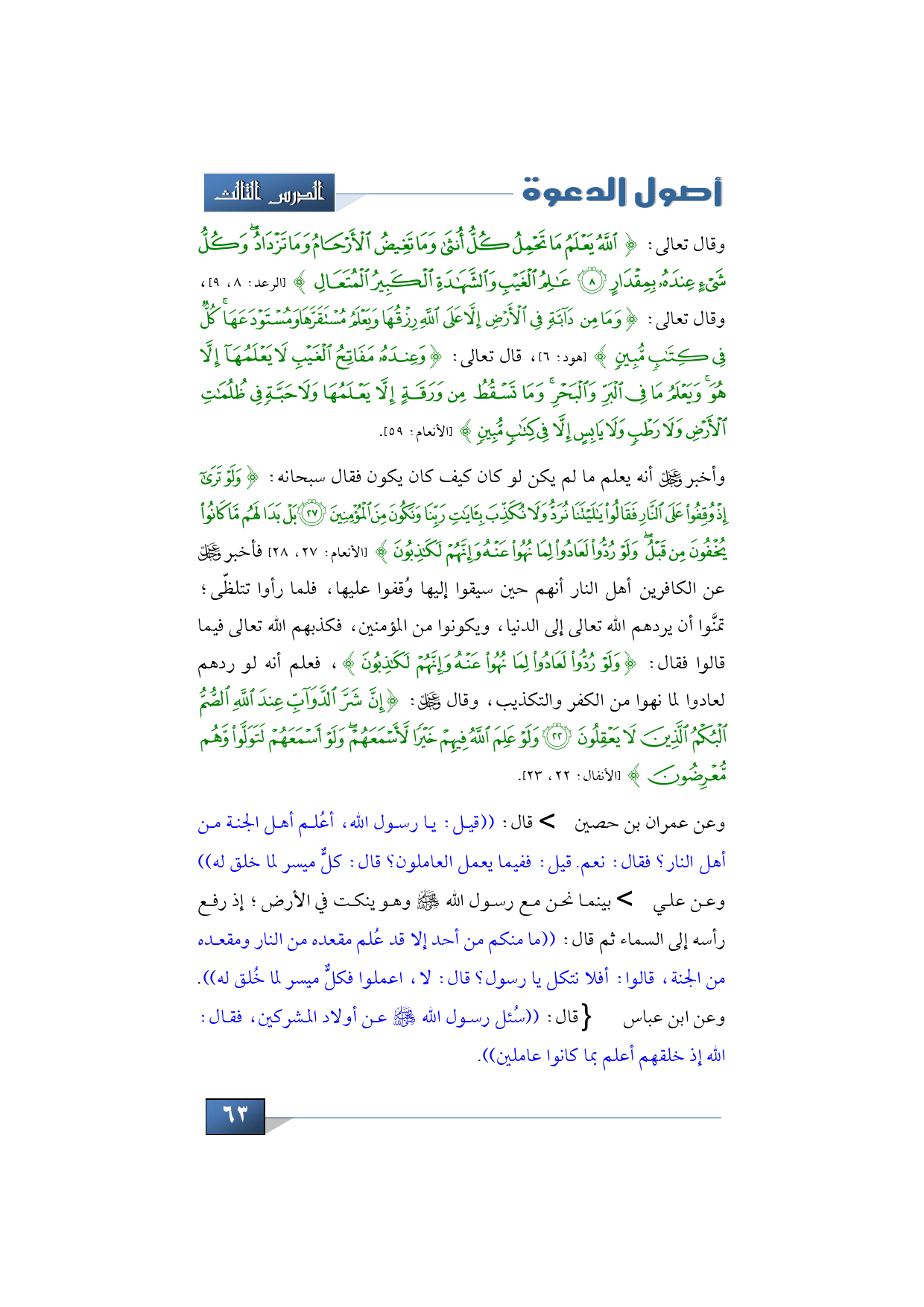 وقال تعالى: {اللَّهُ يَعْلَمُ مَا تَحْمِلُ كُلُّ أُنْثَى وَمَا تَغِيضُ الْأَرْحَامُ * وَمَا تَزْدَادُ وَكُلُّ شَيْءٍ عِنْدَهُ بِمِقْدَارٍ * عَالِمُ الْغَيْبِ وَالشَّهَادَةِ الْكَبِيرُ الْمُتَعَالِ} (الرعد: 8، 9)، وقال تعالى: {وَمَا مِنْ دَابَّةٍ فِي الْأَرْضِ إِلَّا عَلَى اللَّهِ رِزْقُهَا وَيَعْلَمُ مُسْتَقَرَّهَا وَمُسْتَوْدَعَهَا كُلٌّ فِي كِتَابٍ مُبِينٍ} (هود: 6)، قال تعالى: {وَعِنْدَهُ مَفَاتِحُ الْغَيْبِ لَا يَعْلَمُهَا إِلَّا هُوَ وَيَعْلَمُ مَا فِي الْبَرِّ وَالْبَحْرِ وَمَا تَسْقُطُ مِنْ وَرَقَةٍ إِلَّا يَعْلَمُهَا وَلَا حَبَّةٍ فِي ظُلُمَاتِ الْأَرْضِ وَلَا رَطْبٍ وَلَا يَابِسٍ إِلَّا فِي كِتَابٍ مُبِينٍ} (الأنعام: 59).