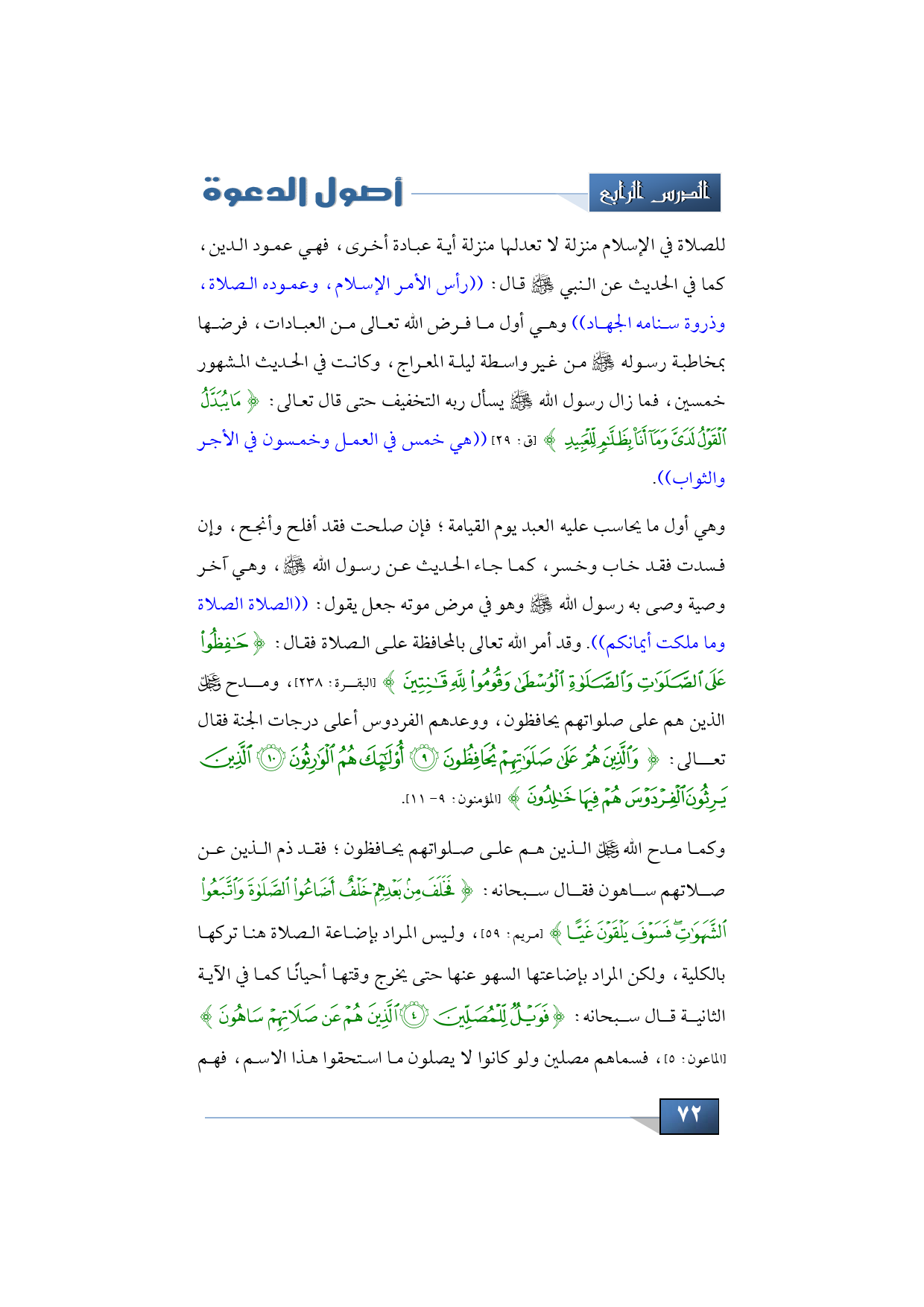 وهي أول ما يحاسب عليه العبد يوم القيامة؛ فإن صلحت فقد أفلح وأنجح، وإن فسدت فقد خاب وخسر، كما جاء الحديث عن رسول الله -صلى الله عليه وسلم، وهي آخر وصية وصى به رسول الله -صلى الله عليه وسلم- وهو في مرض موته جعل يقول: ((الصلاة الصلاة وما ملكت أيمانكم)). وقد أمر الله تعالى بالمحافظة على الصلاة فقال: {حَافِظُوا عَلَى الصَّلَوَاتِ وَالصَّلَاةِ الْوُسْطَى وَقُومُوا لِلَّهِ قَانِتِينَ} (البقرة: 238)، ومدح -سبحانه وتعالى- الذين هم على صلواتهم يحافظون، ووعدهم الفردوس أعلى درجات الجنة فقال تعالى: {وَالَّذِينَ هُمْ عَلَى صَلَوَاتِهِمْ يُحَافِظُونَ * أُولَئِكَ هُمُ الْوَارِثُونَ * الَّذِينَ يَرِثُونَ الْفِرْدَوْسَ هُمْ فِيهَا خَالِدُونَ} (المؤمنون: 9 - 11).