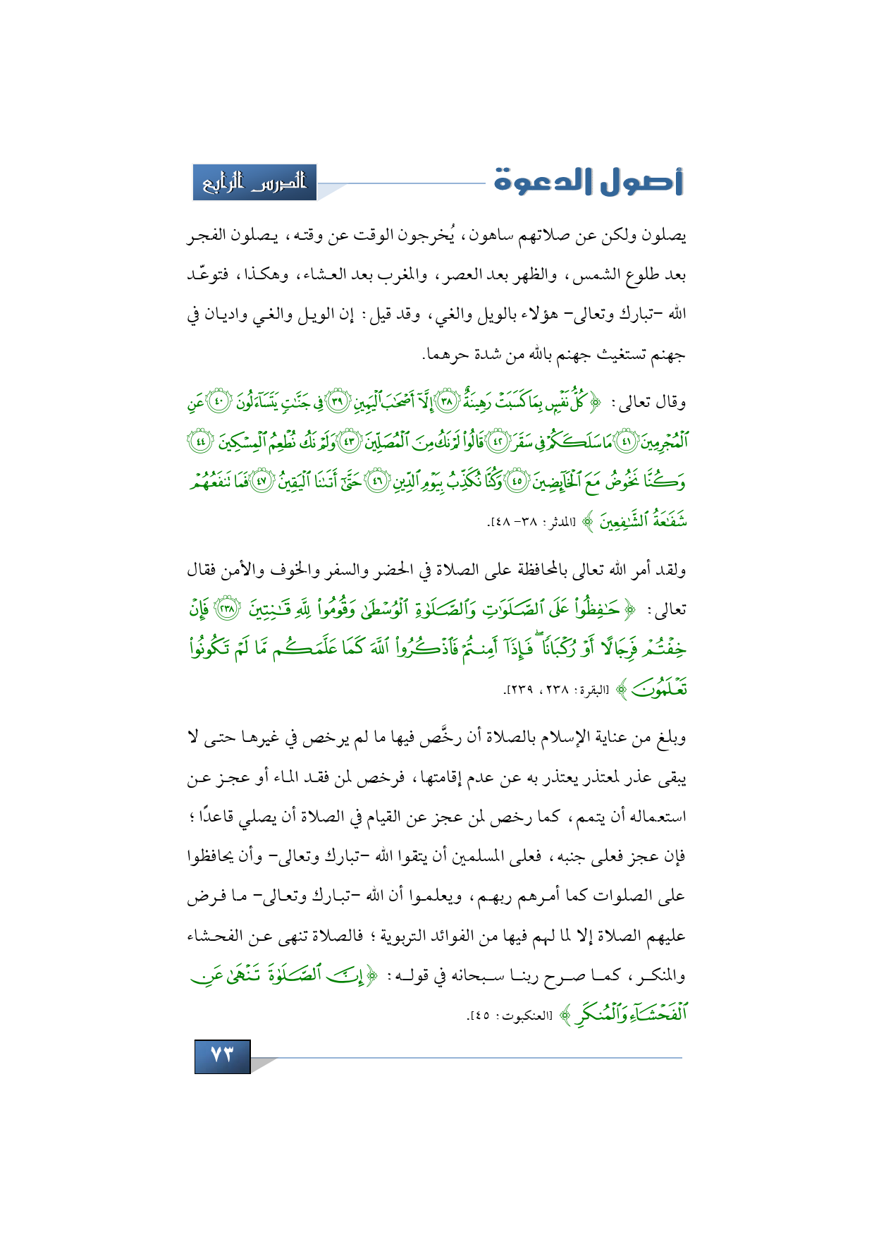 وقال تعالى: {كُلُّ نَفْسٍ بِمَا كَسَبَتْ رَهِينَةٌ إِلَّا أَصْحَابَ الْيَمِينِ * فِي جَنَّاتٍ يَتَسَاءَلُونَ عَنِ الْمُجْرِمِينَ * مَا سَلَكَكُمْ فِي سَقَرَ * قَالُوا لَمْ نَكُ مِنَ الْمُصَلِّينَ * وَلَمْ نَكُ نُطْعِمُ الْمِسْكِينَ * وَكُنَّا نَخُوضُ مَعَ الْخَائِضِينَ * وَكُنَّا نُكَذِّبُ بِيَوْمِ الدِّينِ * حَتَّى أَتَانَا الْيَقِينُ * فَمَا تَنْفَعُهُمْ شَفَاعَةُ الشَّافِعِينَ} (المدثر: 38 - 48). ولقد أمر الله تعالى بالمحافظة على الصلاة في الحضر والسفر والخوف والأمن فقال تعالى: {حَافِظُوا عَلَى الصَّلَوَاتِ وَالصَّلَاةِ الْوُسْطَى وَقُومُوا لِلَّهِ قَانِتِينَ * فَإِنْ خِفْتُمْ فَرِجَالًا أَوْ رُكْبَانًا فَإِذَا أَمِنْتُمْ فَاذْكُرُوا اللَّهَ كَمَا عَلَّمَكُمْ مَا لَمْ تَكُونُوا تَعْلَمُونَ} (البقرة: 238، 239).