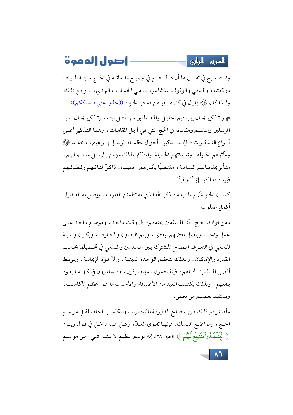 والصحيح في تفسيرها أن هذا عام في جميع مقاماته في الحج من الطواف وركعتيه، والسعي والوقوف بالمشاعر، ورمي الجمار، والهدي، وتوابع ذلك. ولهذا كان -صلى الله عليه وسلم- يقول في كل مشعر من مشعر الحج: ((خذوا عني مناسككم)).