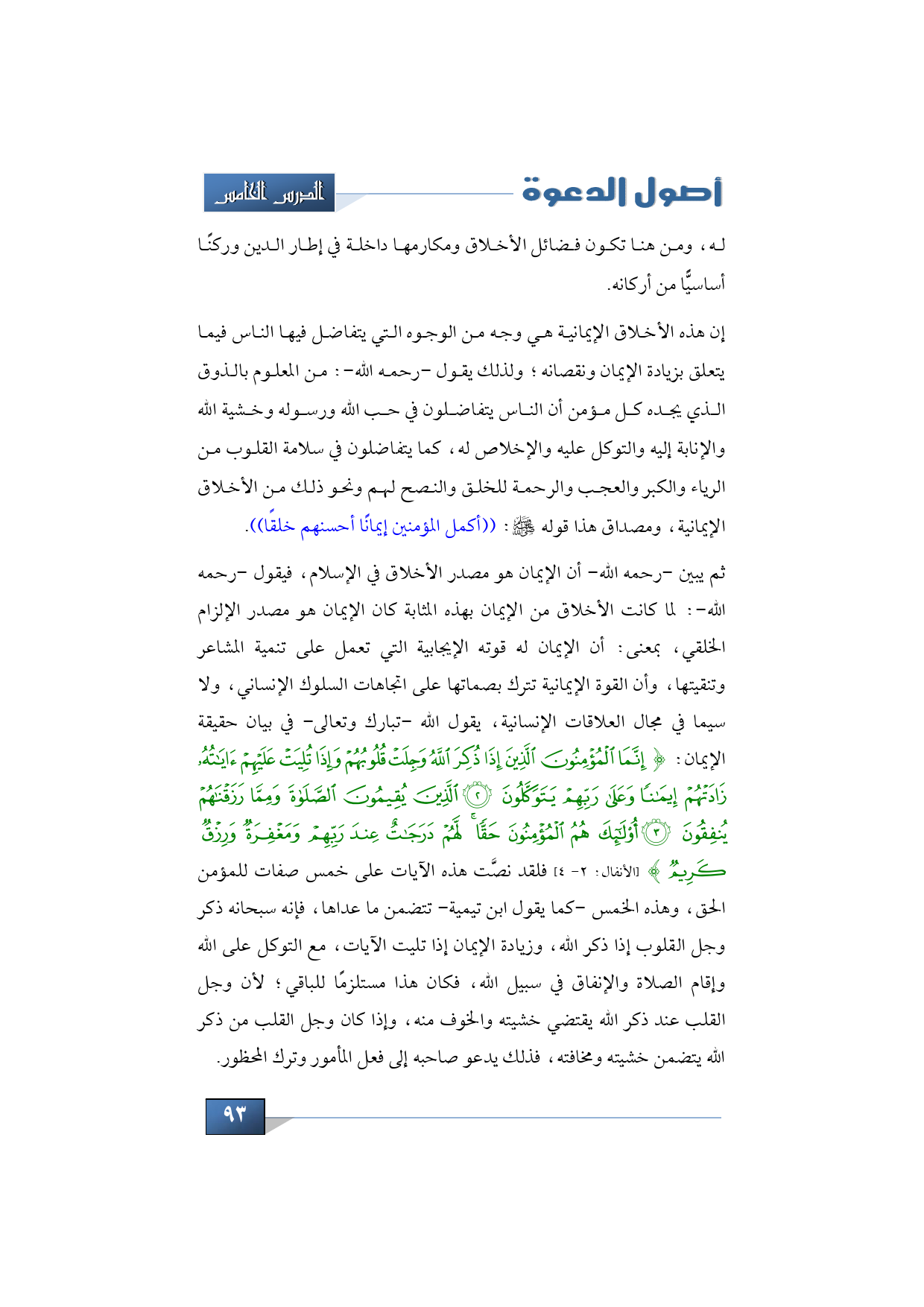 ثم يبين -رحمه الله- أن الإيمان هو مصدر الأخلاق في الإسلام، فيقول -رحمه الله-: لما كانت الأخلاق من الإيمان بهذه المثابة كان الإيمان هو مصدر الإلزام الخلقي، بمعنى: أن الإيمان له قوته الإيجابية التي تعمل على تنمية المشاعر وتنقيتها، وأن القوة الإيمانية تترك بصماتها على اتجاهات السلوك الإنساني، ولا سيما في مجال العلاقات الإنسانية، يقول الله -تبارك وتعالى- في بيان حقيقة الإيمان: {إِنَّمَا الْمُؤْمِنُونَ الَّذِينَ إِذَا ذُكِرَ اللَّهُ وَجِلَتْ قُلُوبُهُمْ وَإِذَا تُلِيَتْ عَلَيْهِمْ آيَاتُهُ زَادَتْهُمْ إِيمَانًا وَعَلَى رَبِّهِمْ يَتَوَكَّلُونَ * الَّذِينَ يُقِيمُونَ الصَّلَاةَ وَمِمَّا رَزَقْنَاهُمْ يُنْفِقُونَ * أُولَئِكَ هُمُ الْمُؤْمِنُونَ حَقًّا لَهُمْ دَرَجَاتٌ عِنْدَ رَبِّهِمْ وَمَغْفِرَةٌ وَرِزْقٌ كَرِيمٌ} (الأنفال: 2 - 4) فلقد نصَّت هذه الآيات على خمس صفات للمؤمن الحق، وهذه الخمس -كما يقول ابن تيمية- تتضمن ما عداها، فإنه سبحانه ذكر وجل القلوب إذا ذكر الله، وزيادة الإيمان إذا تليت الآيات، مع التوكل على الله وإقام الصلاة والإنفاق في سبيل الله، فكان هذا مستلزمًا للباقي؛ لأن وجل القلب عند ذكر الله يقتضي خشيته والخوف منه، وإذا كان وجل القلب من ذكر الله يتضمن خشيته ومخافته، فذلك يدعو صاحبه إلى فعل المأمور وترك المحظور.