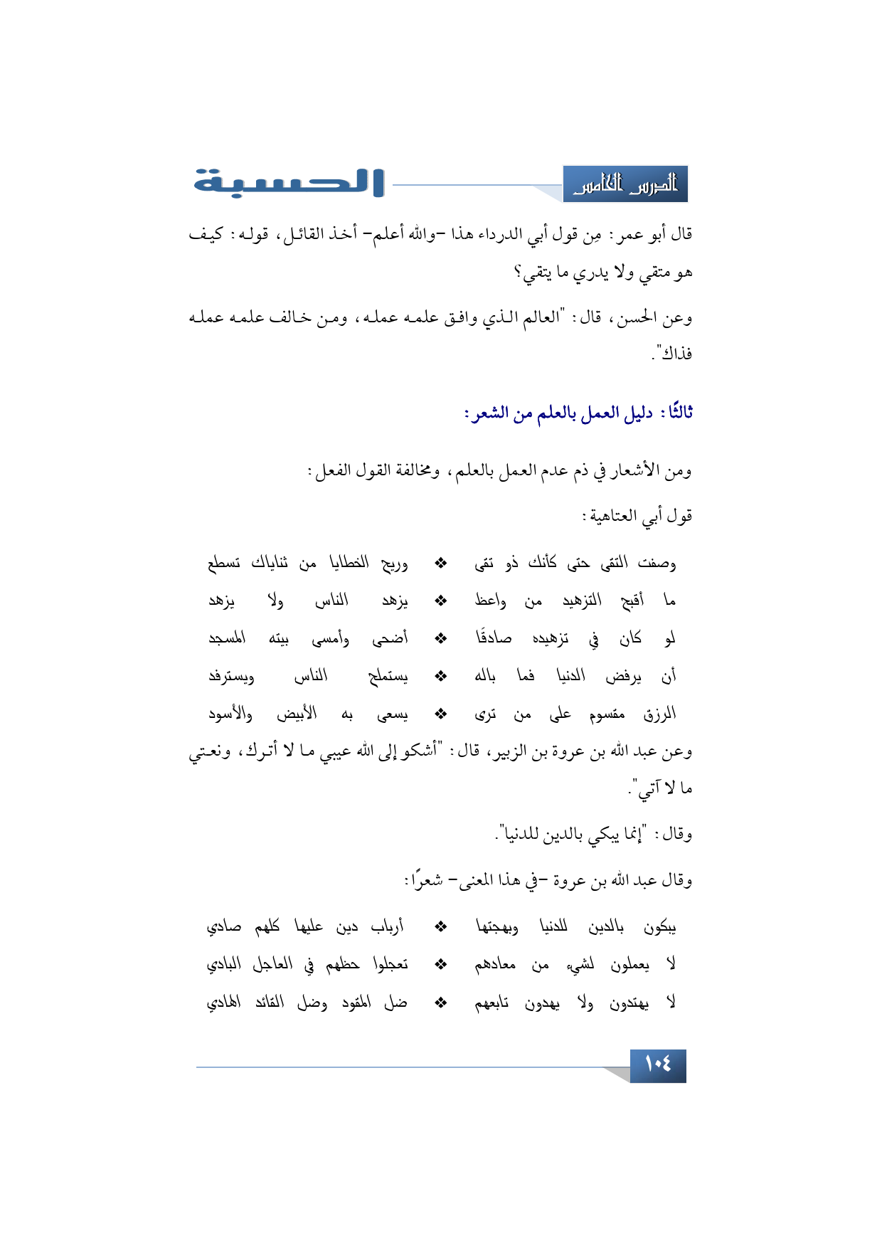 ومن الأشعار في ذم عدم العمل بالعلم، ومخالفة القول الفعل: قول أبي العتاهية: