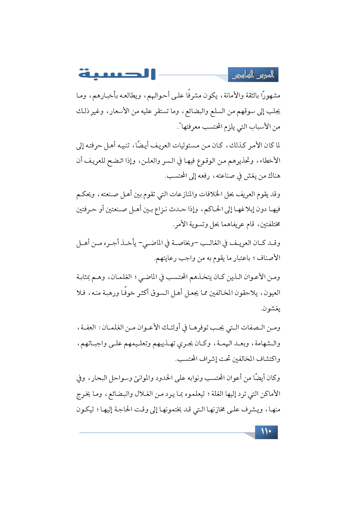 مشهورًا بالثقة والأمانة، يكون مشرفًا على أحوالهم، ويطالعه بأخبارهم، وما يجلب إلى سوقهم من السلع والبضائع، وما تستقر عليه من الأسعار، وغير ذلك من الأسباب التي يلزم المحتسب معرفتها".