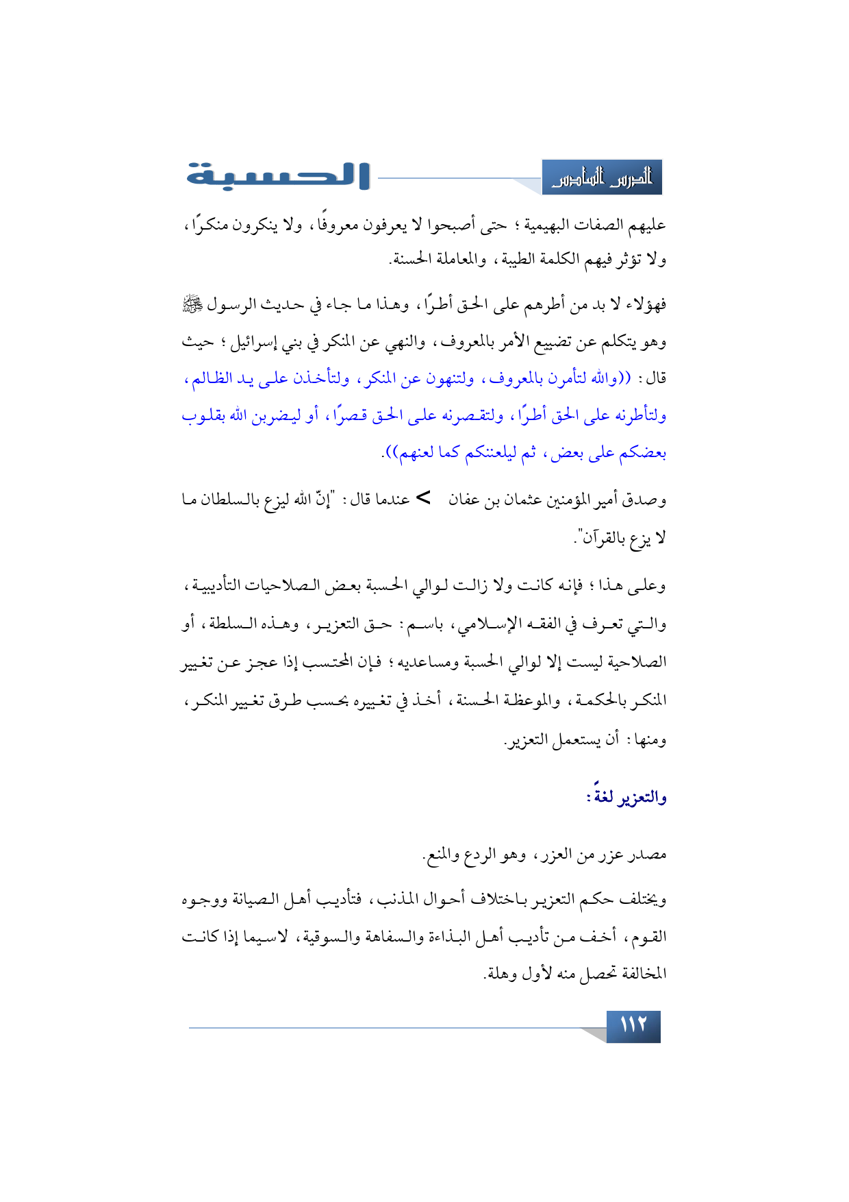 وعلى هذا؛ فإنه كانت ولا زالت لوالي الحسبة بعض الصلاحيات التأديبية، والتي تعرف في الفقه الإسلامي باسم: حق التعزير. وهذه السلطة أو الصلاحية ليست إلا لوالي الحسبة ومساعديه؛ فإن المحتسب إذا عجز عن تغيير المنكر بالحكمة والموعظة الحسنة أخذ في تغييره بحسب طرق تغيير المنكر، ومنها: أن يستعمل التعزير.