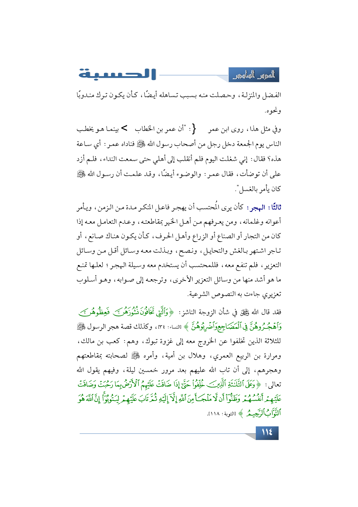 ثالثًا: الهجر: كأن يرى المُحتسب أن يهجر فاعل المنكر مدة من الزمن، ويأمر أعوانه وغلمانه، ومن يعرفهم من أهل الخير بمقاطعته، وعدم التعامل معه إذا كان من التجار أو الصناع أو الزراع وأهل الحرف، كأن يكون هناك صانع، أو تاجر اشتهر بالغش والتحايل، ونصح وبذلت معه وسائل أقل من وسائل التعزير، فلم تنفع معه، فللمحتسب أن يستخدم معه وسيلة الهجر؛ لعلها تمنع ما هو أشد منها من وسائل التعزير الأخرى، وترجعه إلى صوابه، وهو أسلوب تعزيري جاءت به النصوص الشرعية.
