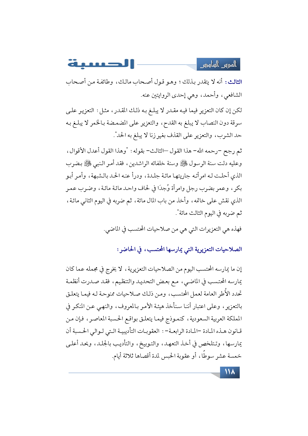 أما الصلاحيات التعزيرية التي يمارسها المحتسب في الحاضر: فإن ما يمارسه المحتسب اليوم من الصلاحيات التعزيرية لا يخرج في مجمله عما كان يمارسه المحتسب في الماضي مع بعض التحديد والتنظيم، فقد صدرت أنظمة تحدد الأطر العامة لعمل المحتسب، ومن ذلك صلاحيات ممنوحة له فيما يتعلق بالتعزير، وعلى اعتبار أننا سنأخذ هيئة الأمر بالمعروف والنهي عن المنكر في المملكة العربية السعودية كنموذج فيما يتعلق بواقع الحسبة المعاصر، فإن من قانون هذه المادة، المادة الرابعة: العقوبات التأديبية التي لوالي الحسبة أن يمارسها، وتتلخص في أخذ التعهد، التوبيخ، التأديب بالجلد، وبحد أعلى خمسة عشر سوطًا، أو عقوبة الحبس لمدة أقصاها ثلاثة أيام.