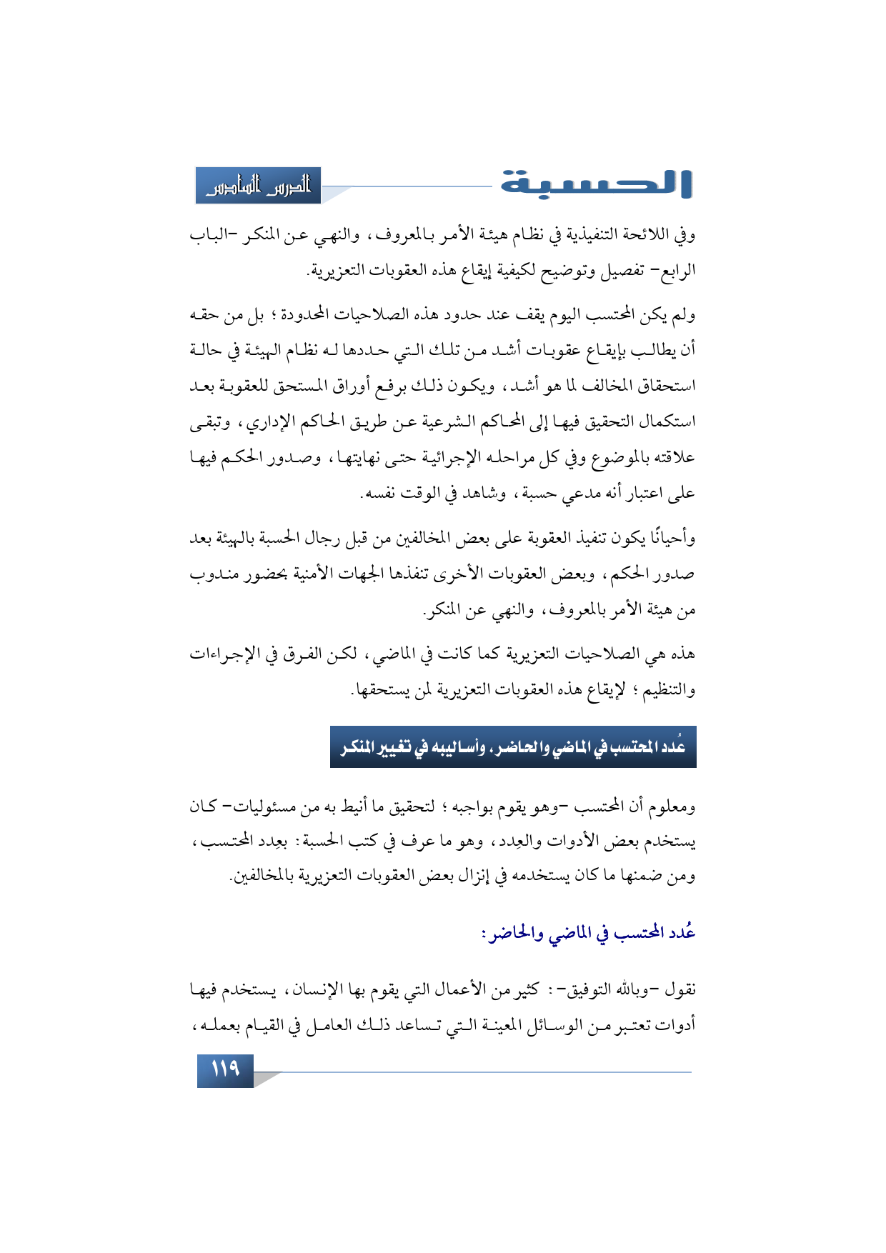 ومعلوم أن المحتسب وهو يقوم بواجبه لتحقيق ما أنيط به من مسئوليات كان يستخدم بعض الأدوات والعدد، وهو ما عرف في كتب الحسبة: بعدد المحتسب، ومن ضمنها ما كان يستخدمه في إنزال بعض العقوبات التعزيرية بالمخالفين، فما هي عُدد المحتسب في الماضي والحاضر؟