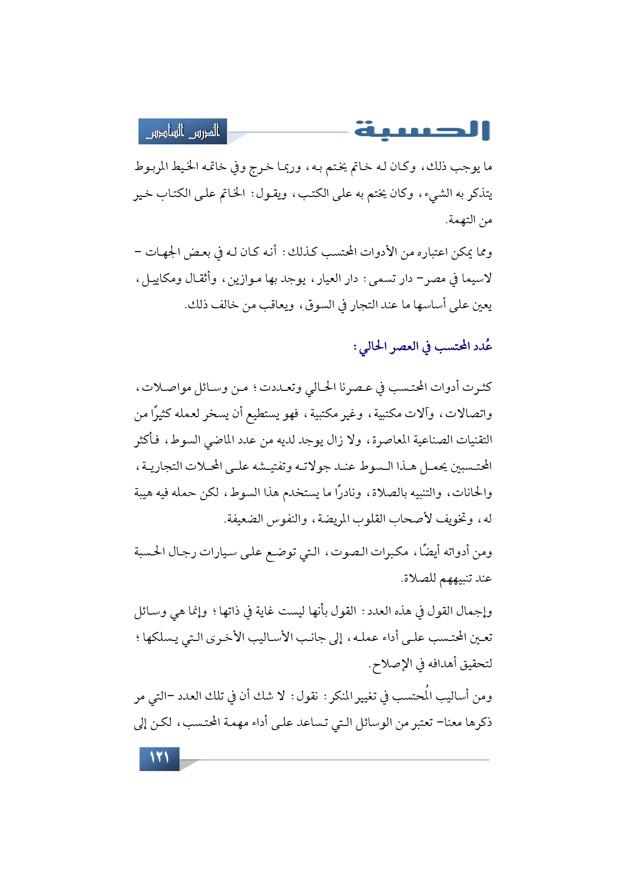 وأما مُحتسب اليوم: فكثيرة أدواته، من وسائل مواصلات، واتصالات، وآلات مكتبية، وغير مكتبية، فهو يستطيع أن يسخر لعمله كثيرًا من التقنيات الصناعية المعاصرة، ولا زال يوجد لديه من عدد الماضي السوط، فأكثر المحتسبين يحمل هذا السوط عند جولاته وتفتيشه على المحلات التجارية، والحانات، والتنبيه بالصلاة، ونادرًا ما يستخدم هذا السوط، لكن حمله فيه هيبة له، وتخويف لأصحاب القلوب المريضة، والنفوس الضعيفة. ومن أدواته أيضًا مكبرات الصوت التي تركب على سيارات رجال الحسبة عند تنبيههم للصلاة.