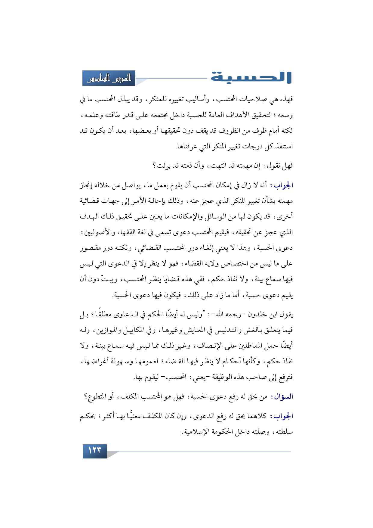 ولذا يقول ابن خلدون -رحمه الله-: "وليس له أيضًا الحكم في الدعاوى مطلقًا، بل فيما يتعلق بالغش والتدليس في المعايش وغيرها، وفي المكاييل والموازين، وله أيضًا حمل المماطلين على الإنصاف، وغير ذلك مما ليس فيه سماع بينة، ولا نفاذ حكم، وكأنها أحكام لا ينظر فيها القضاء لعمومها وسهولة أغراضها، فترفع إلى صاحب هذه الوظيفة -يعني: المحتسب-؛ ليقوم بها.