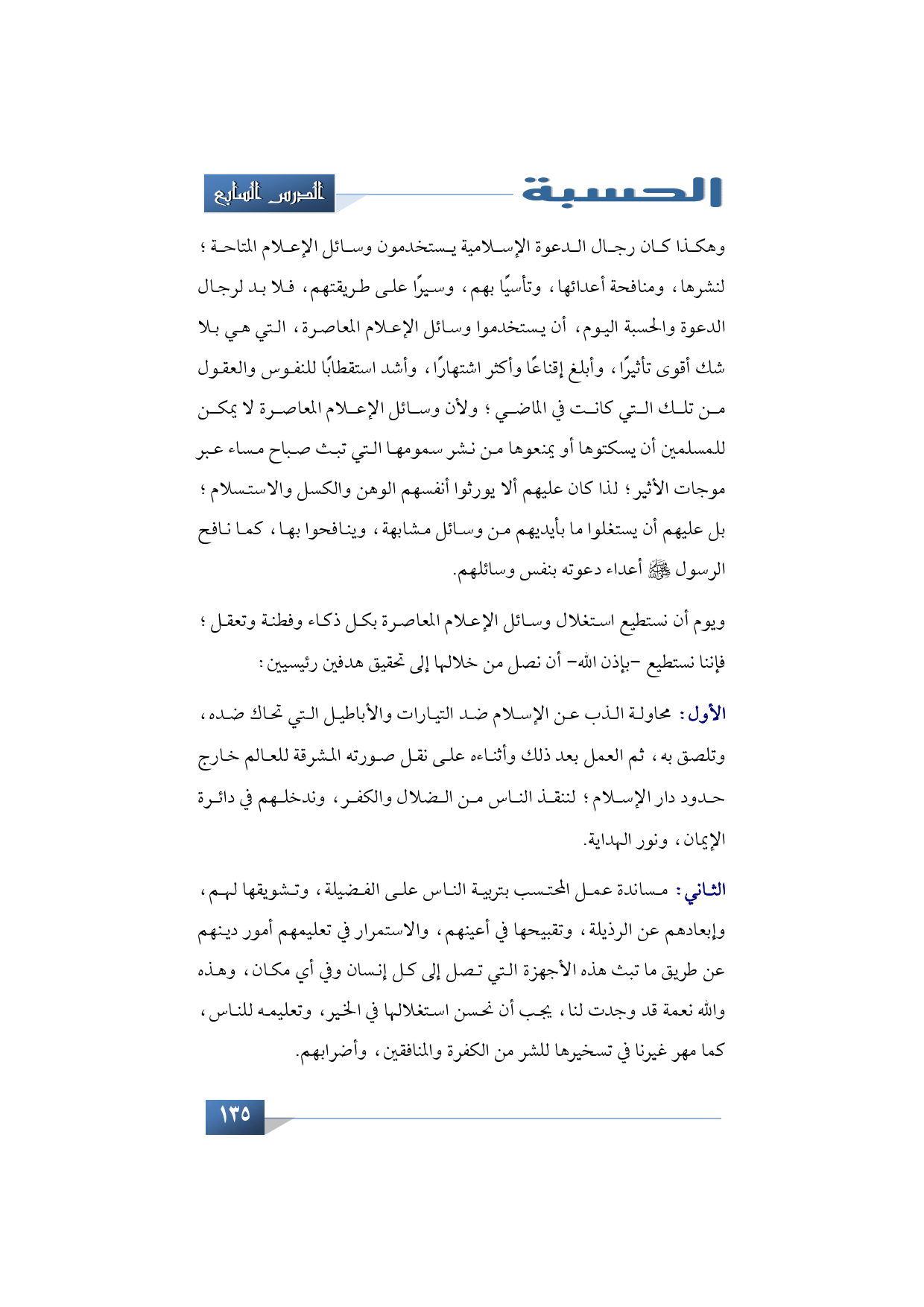 وهكذا كان رجال الدعوة الإسلامية يستخدمون وسائل الإعلام المتاحة لنشرها، ومنافحة أعدائها، وتأسيًا بهم وسيرًا على طريقتهم، لا بد لرجال الدعوة والحسبة اليوم أن يستخدموا وسائل الإعلام المعاصرة التي هي بلا شك أقوى تأثيرًا، وأبلغ إقناعًا وأكثر اشتهارًا، وأشد استقطابًا للنفوس والعقول من تلك التي كانت في الماضي؛ ولأن وسائل الإعلام المعاصرة لا يمكن للمسلمين أن يسكتوها أو يمنعوها من نشر سمومها التي تبث صباح مساء عبر موجات الأثير؛ لذا كان عليهم ألا يورثوا أنفسهم الوهن والكسل والاستسلام، بل عليهم أن يستغلوا ما بأيديهم من وسائل مشابهة، وينافحوا بها كما نافح الرسول -صلى الله عليه وسلم- أعداء دعوته بنفس وسائلهم.