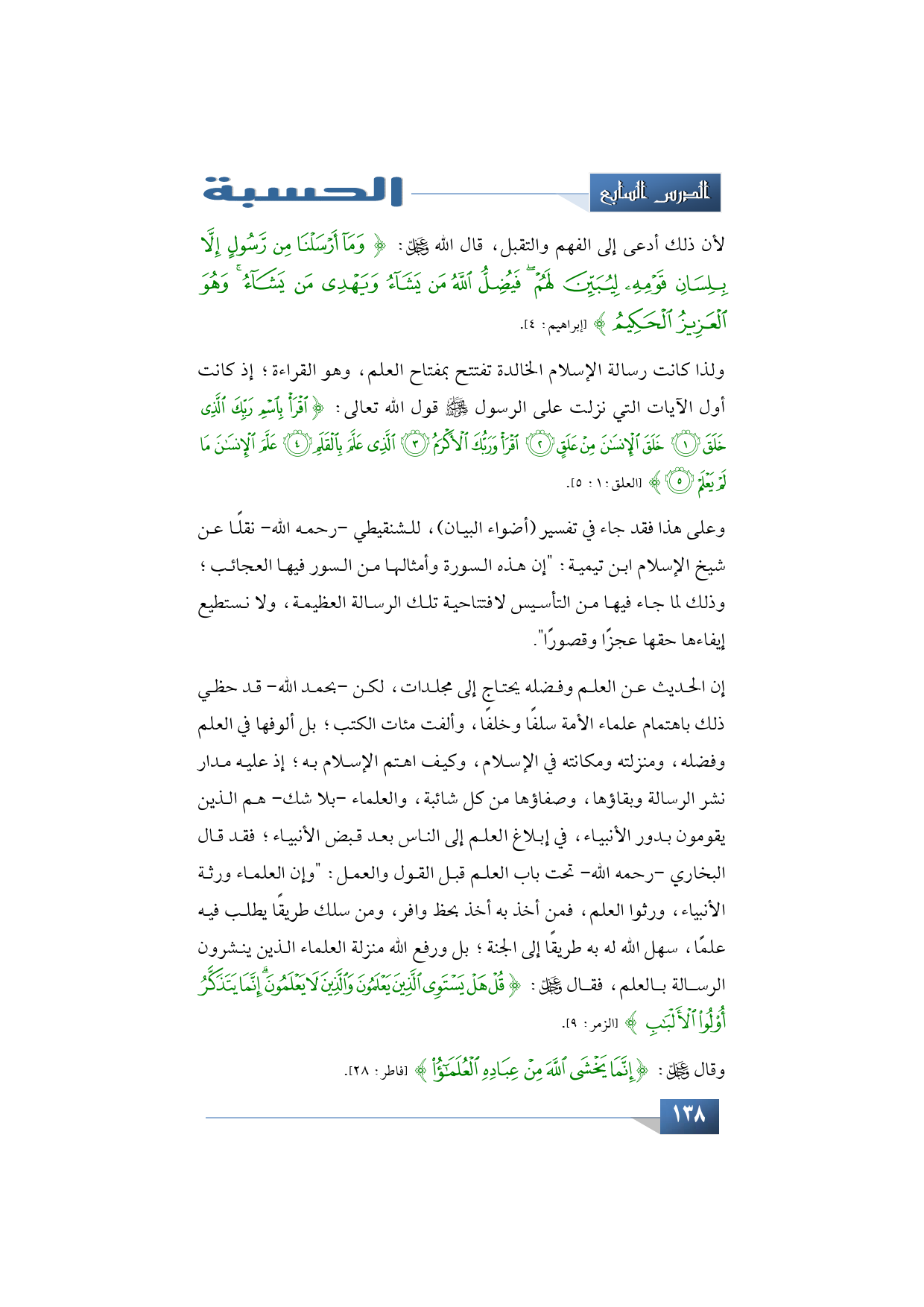 ولذا كانت رسالة الإسلام الخالدة تفتتح بمفتاح العلم، وهو القراءة إذ كانت أول الآيات التي نزلت على الرسول -صلى الله عليه وسلم- قول الله -تبارك وتعالى-: {اقْرَأْ بِاسْمِ رَبِّكَ الَّذِي خَلَقَ * خَلَقَ الْإِنْسَانَ مِنْ عَلَقٍ * اقْرَأْ وَرَبُّكَ الْأَكْرَمُ * الَّذِي عَلَّمَ بِالْقَلَمِ * عَلَّمَ الْإِنْسَانَ مَا لَمْ يَعْلَمْ} (العلق:1: 5).