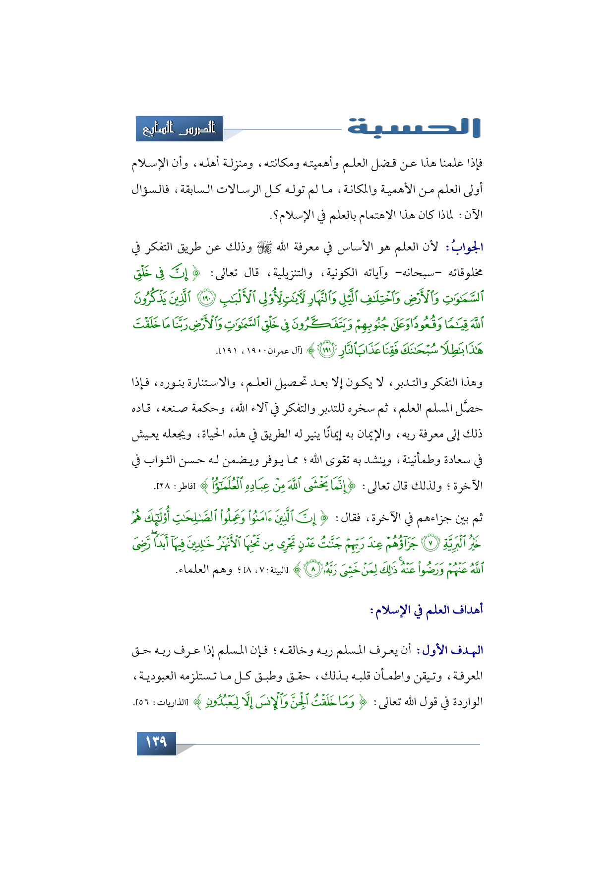 وهذا أول أهداف العلم في الإسلام: أن يعرف المسلم ربه وخالقه؛ فإن المسلم إذا عرف ربه حق المعرفة، وتيقن واطمأن قلبه بذلك حقق، وطبق كل ما تستلزمه العبودية الواردة في قول الله تعالى: {وَمَا خَلَقْتُ الْجِنَّ وَالْإِنْسَ إِلَّا لِيَعْبُدُونِ} (الذاريات: 56).