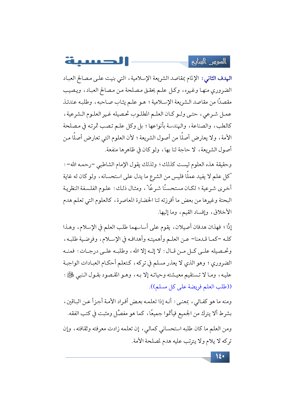 وثاني الأهداف للعلم في الإسلام: هو الإلمام بمقاصد الشريعة الإسلامية التي بنيت على مصالح العباد الضروري منها وغيره، وكل علم يحقق مصلحة من مصالح العباد، ويصيب مقصدًا من مقاصد الشريعة الإسلامية هو علم يثاب صاحبه، وطلبه عندئذ عمل شرعي، حتى ولو كان العلم المطلوب تحصيله غير العلوم الشرعية، كالطب، والصناعة، والهندسة بأنواعها، بل وكل علم تصب ثمرته في مصلحة الأمة، ولا يعارض أصلًا من أصول الشريعة؛ لأن العلوم التي تعارض أصلًا من أصول الشريعة لا حاجة لنا بها، ولو كان في ظاهرها منفعة.