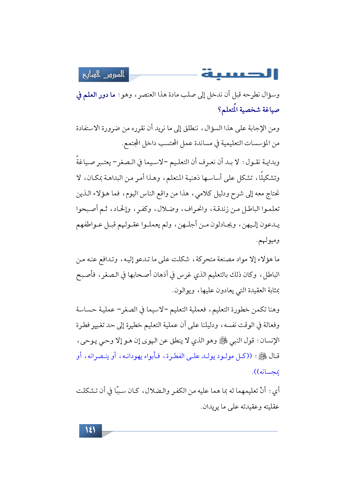 وسؤال أطرحه قبل أن أدخل إلى صلب مادة هذا العنصر وهو: ما دور العلم في صياغة شخصية المُتعلم؟ ومن الإجابة على هذا السؤال ننطلق إلى ما نريد أن نقرره من ضرورة الاستفادة من المؤسسات التعليمية في مساندة عمل المحتسب داخل المجتمع.