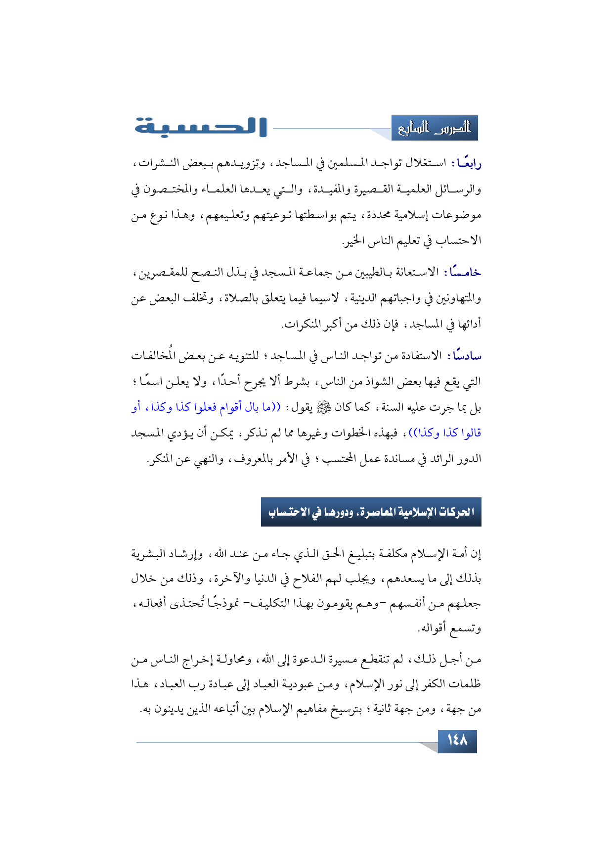 رابعًا: استغلال تواجد المسلمين في المساجد، وتزويدهم ببعض النشرات، والرسائل العلمية القصيرة والمفيدة، والتي يعدها العلماء والمختصون في موضوعات إسلامية محددة، يتم بواسطتها توعيتهم وتعليمهم، وهذا نوع من الاحتساب في تعليم الناس الخير.