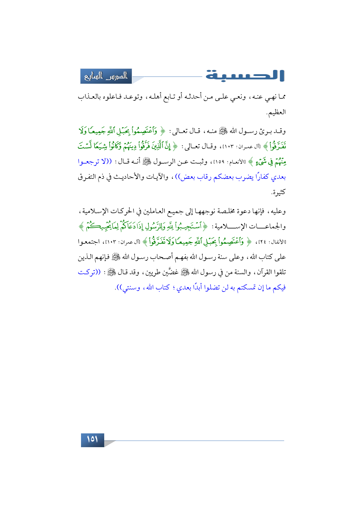 وقد برئ رسول الله -صلى الله عليه وسلم- منه، قال الله تعالى: {وَاعْتَصِمُوا بِحَبْلِ اللَّهِ جَمِيعًا وَلَا تَفَرَّقُوا} (آل عمران: 103)، وقال تعالى: {إِنَّ الَّذِينَ فَرَّقُوا دِينَهُمْ وَكَانُوا شِيَعًا لَسْتَ مِنْهُمْ فِي شَيْءٍ} (الأنعام: 159)، وثبت عن الرسول -صلى الله عليه وسلم- أنه قال: ((لا ترجعوا بعدي كفارًا يضرب بعضكم رقاب بعض))، والآيات والأحاديث في ذم التفرق كثيرة.