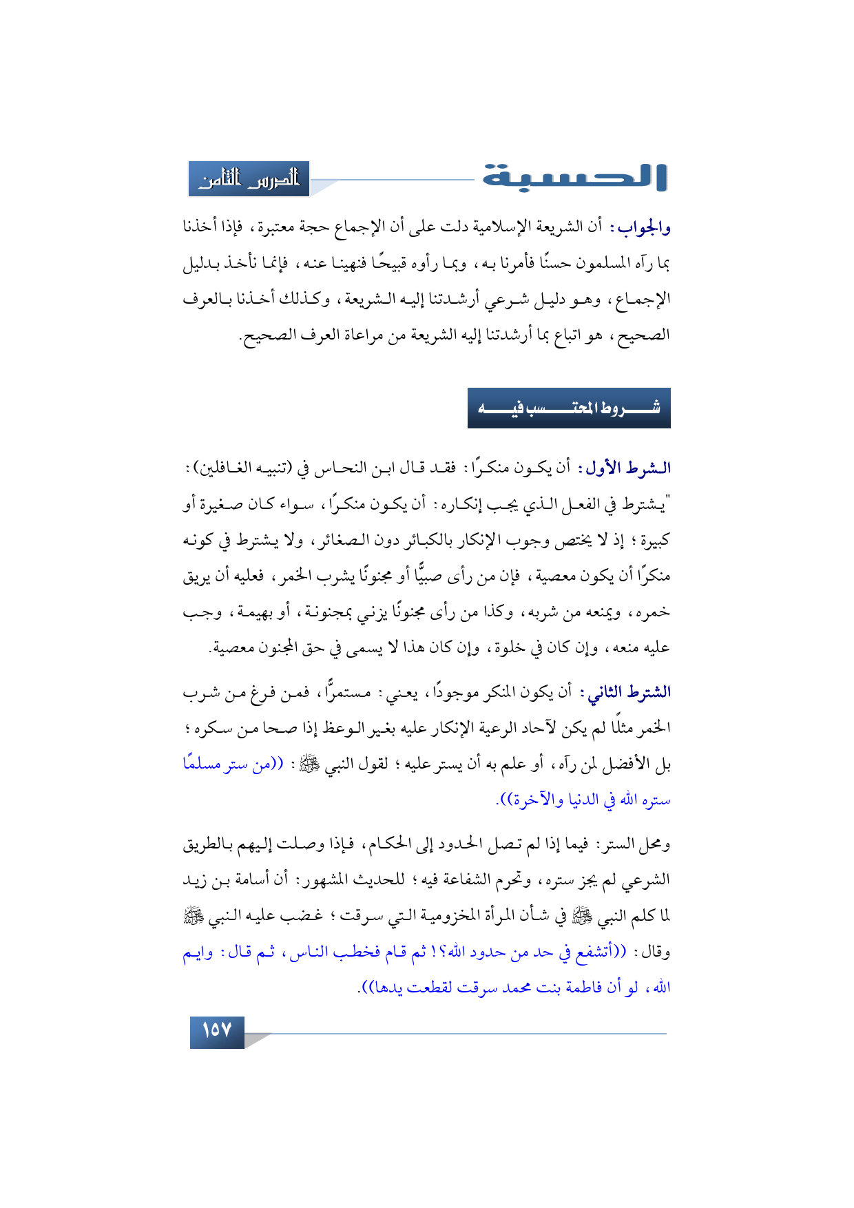 أما شروطه: فقد قال ابن النحاس في (تنبيه الغافلين): "يشترط في الفعل الذي يجب إنكاره: أن يكون منكرًا، سواء كان صغيرة أو كبيرة؛ إذ لا يختص وجوب الإنكار بالكبائر دون الصغائر، ولا يشترط في كونه منكرًا أن يكون معصية، فإن من رأى صبيًّا أو مجنونًا يشرب الخمر، فعليه أن يريق خمره، ويمنعه من شربه، وكذا من رأى مجنونًا يزني بمجنونة، أو بهيمة، وجب عليه منعه، وإن كان في خلوة، وإن كان هذا لا يسمى في حق المجنون معصية.