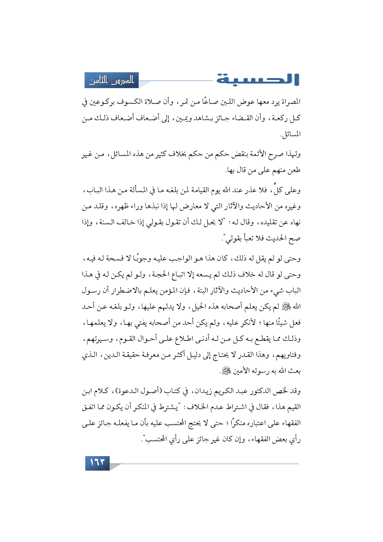 وقد لخص الدكتور عبد الكريم زيدان في كتاب (أصول الدعوة) كلام ابن القيم هذا فقال في اشتراط عدم الخلاف: يشترط في المنكر أن يكون مما اتفق الفقهاء على اعتباره منكرًا؛ حتى لا يحتج المحتسب عليه بأن ما يفعله جائز على رأي بعض الفقهاء، وإن كان غير جائز على رأي المحتسب.