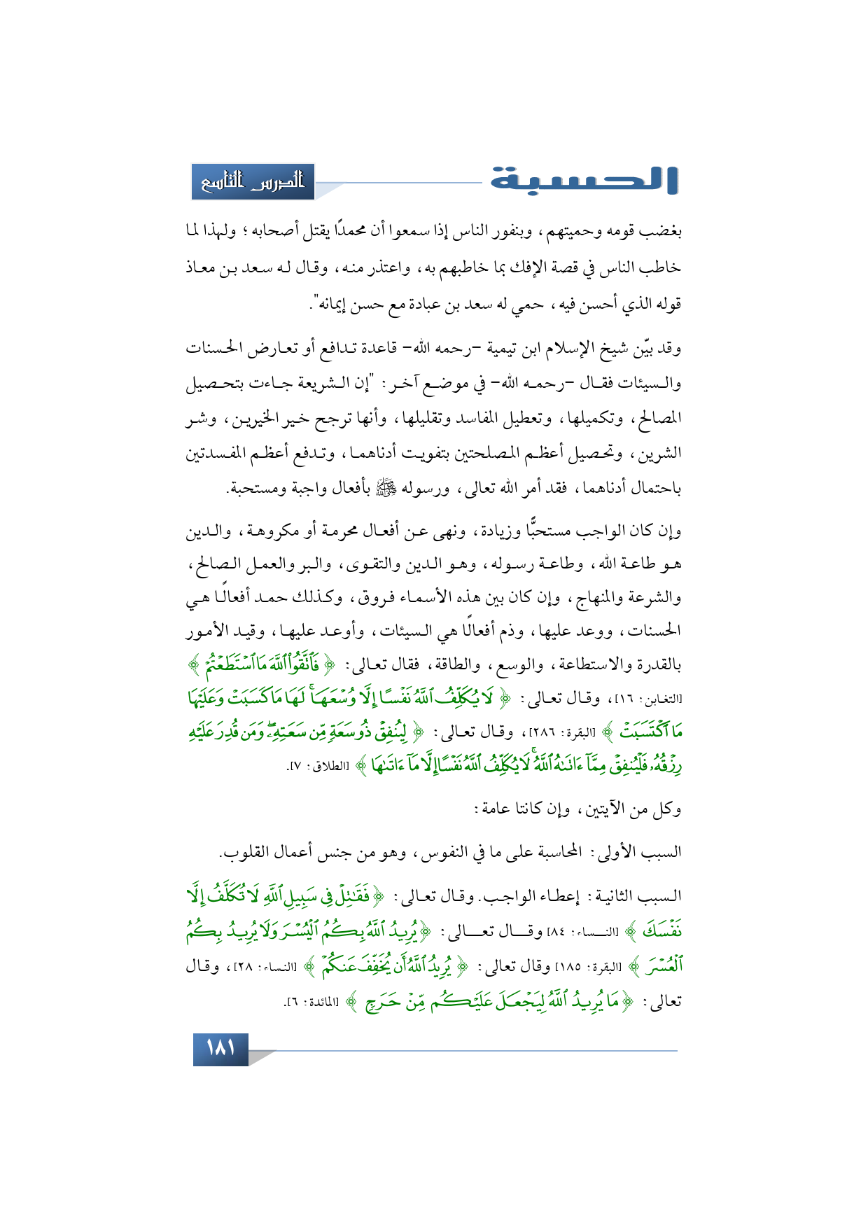 وكل من الآيتين، وإن كانت عام: فسبب الأولى: المحاسبة على ما في النفوس، وهو من جنس أعمال القلوب. وسبب الثانية: إعطاء الواجب. وقال تعالى: {فَقَاتِلْ فِي سَبِيلِ اللَّهِ لَا تُكَلَّفُ إِلَّا نَفْسَكَ} (النساء: 84) وقال تعالى: {يُرِيدُ اللَّهُ بِكُمُ الْيُسْرَ وَلَا يُرِيدُ بِكُمُ الْعُسْرَ} (البقرة: 185) وقال تعالى: {يُرِيدُ اللَّهُ أَنْ يُخَفِّفَ عَنْكُمْ} (النساء: 28)، وقال تعالى: {مَا يُرِيدُ اللَّهُ لِيَجْعَلَ عَلَيْكُمْ مِنْ حَرَجٍ} (المائدة: 6).