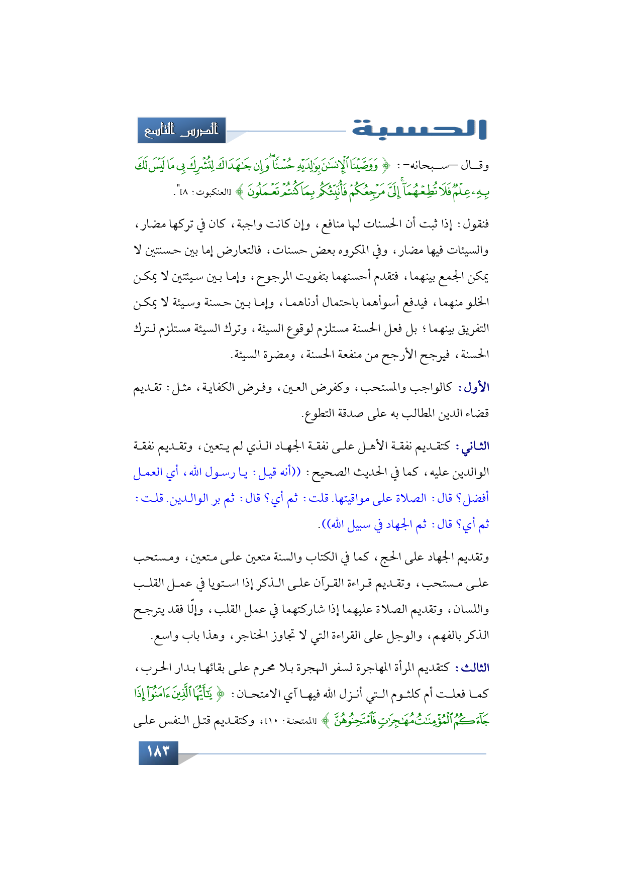 والثاني: كتقديم نفقة الأهل على نفقة الجهاد الذي لم يتعين، وتقديم نفقة الوالدين عليه، كما في الحديث الصحيح: ((أنه قيل: يا رسول الله، أي العمل أفضل؟ قال: الصلاة على مواقيتها. قلت: ثم أي؟ قال: ثم بر الوالدين. قلت: ثم أي؟ قال: ثم الجهاد في سبيل الله)).