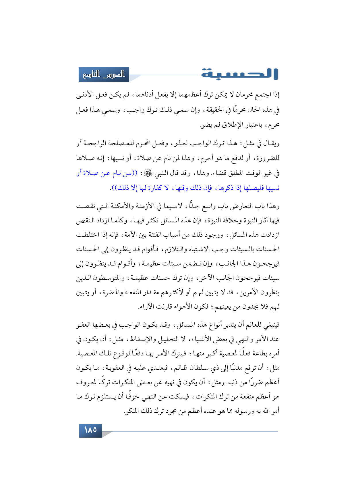 فينبغي للعالم أن يتدبر أنواع هذه المسائل، وقد يكون الواجب في بعضها العفو عند الأمر والنهي في بعض الأشياء، لا التحليل والإسقاط، مثل: أن يكون في أمره بطاعة فعلًا لمعصية أكبر منها؛ فيترك الأمر بها دفعًا لوقوع تلك المعصية. مثل: أن ترفع مذنبًا إلى ذي سلطان ظالم، فيعتدي عليه في العقوبة، ما يكون أعظم ضررًا من ذنبه. ومثل: أن يكون في نهيه عن بعض المنكرات تركًا لمعروف هو أعظم منفعة من ترك المنكرات، فيسكت عن النهي خوفًا أن يستلزم ترك ما أمر الله به ورسوله مما هو عنده أعظم من مجرد ترك ذلك المنكر.