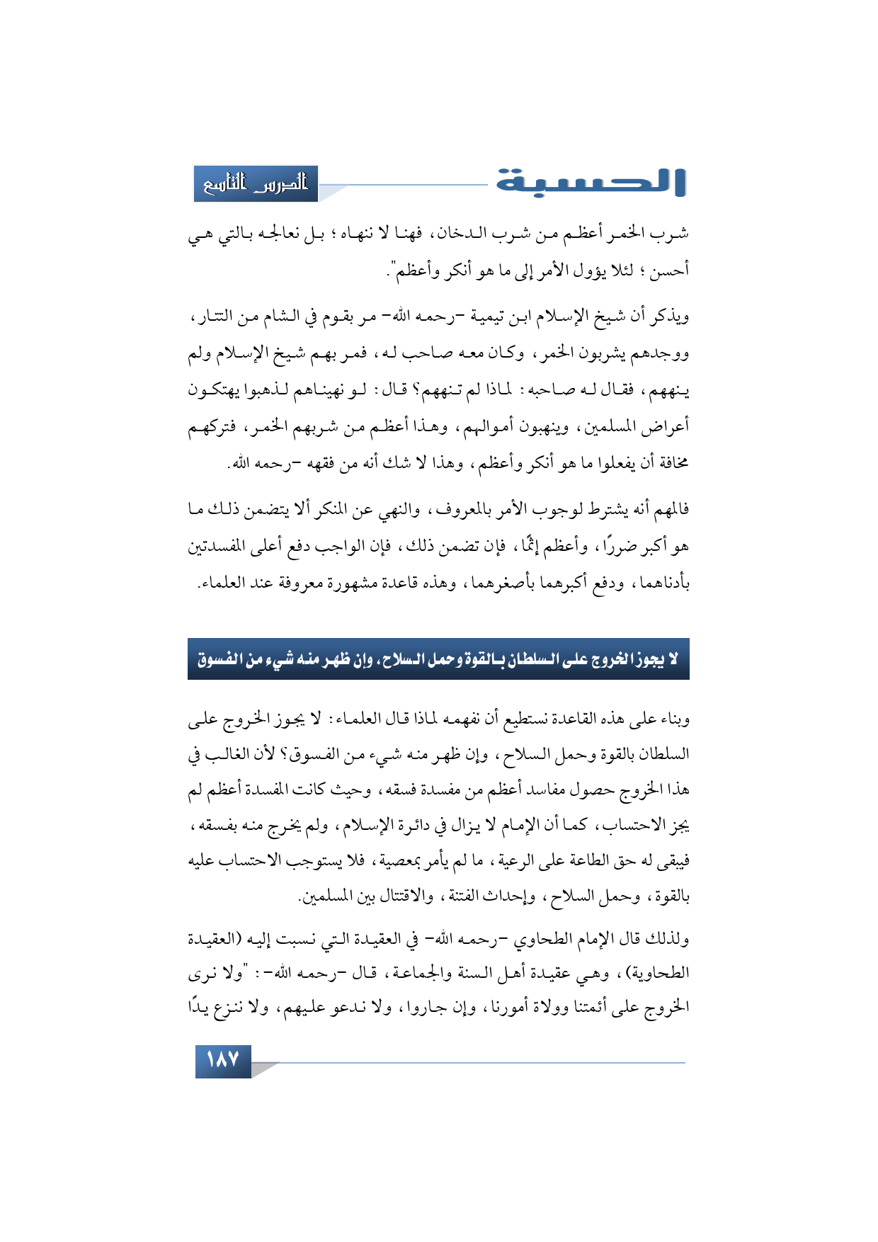 وبناء على هذه القاعدة نستطيع أن نفهمه لماذا قال العلماء: لا يجوز الخروج على السلطان بالقوة وحمل السلاح، وإن ظهر منه شيء من الفسوق؟ لأن الغالب في هذا الخروج حصول مفاسد أعظم من مفسدة فسقه، وحيث كانت المفسدة أعظم لم يجز الاحتساب، كما أن الإمام لا يزال في دائرة الإسلام، ولم يخرج منه بفسقه، فيبقى له حق الطاعة على الرعية، ما لم يأمر بمعصية، فلا يستوجب الاحتساب عليه بالقوة، وحمل السلاح، وإحداث الفتنة، والاقتتال بين المسلمين.