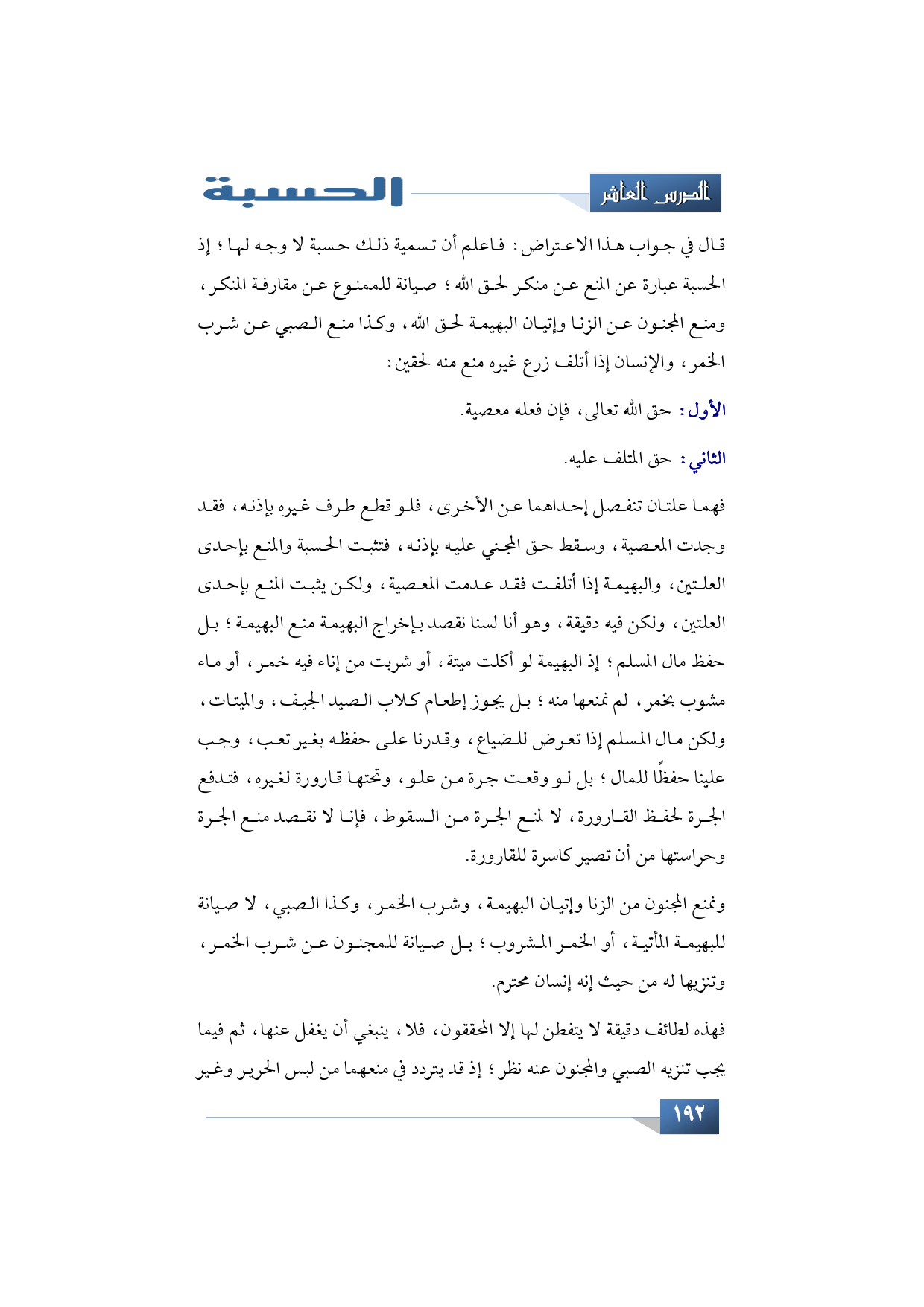 قال في جواب هذا الاعتراض: فاعلم أن تسمية ذلك حسبة لا وجه لها؛ إذ الحسبة عبارة عن المنع عن منكر لحق الله؛ صيانة للممنوع عن مقارفة المنكر، ومنع المجنون عن الزنا وإتيان البهيمة لحق الله، وكذا منع الصبي عن شرب الخمر، والإنسان إذا أتلف زرع غيره منع منه لحقين: