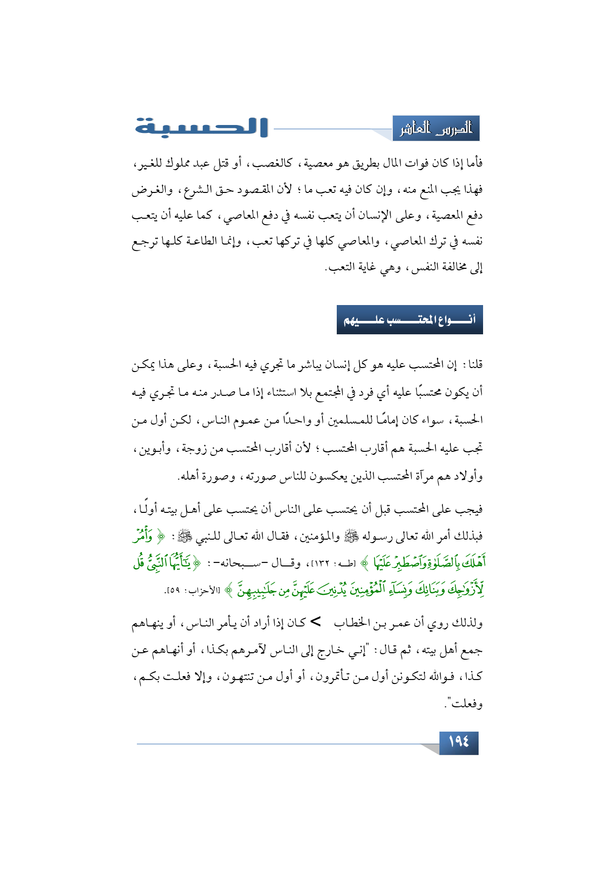 قلنا: إن المحتسب عليه هو كل إنسان يباشر ما تجري فيه الحسبة، وعلى هذا يمكن أن يكون محتسبًا عليه أي فرد في المجتمع بلا استثناء إذا ما صدر منه ما تجري فيه الحسبة، سواء كان إمامًا للمسلمين أو واحدًا من عموم الناس، لكن أول من تجب عليه الحسبة هم أقارب المحتسب؛ لأن أقارب المحتسب من زوجة، وأبوين، وأولاد هم مرآة المحتسب الذين يعكسون للناس صورته، وصورة أهله.