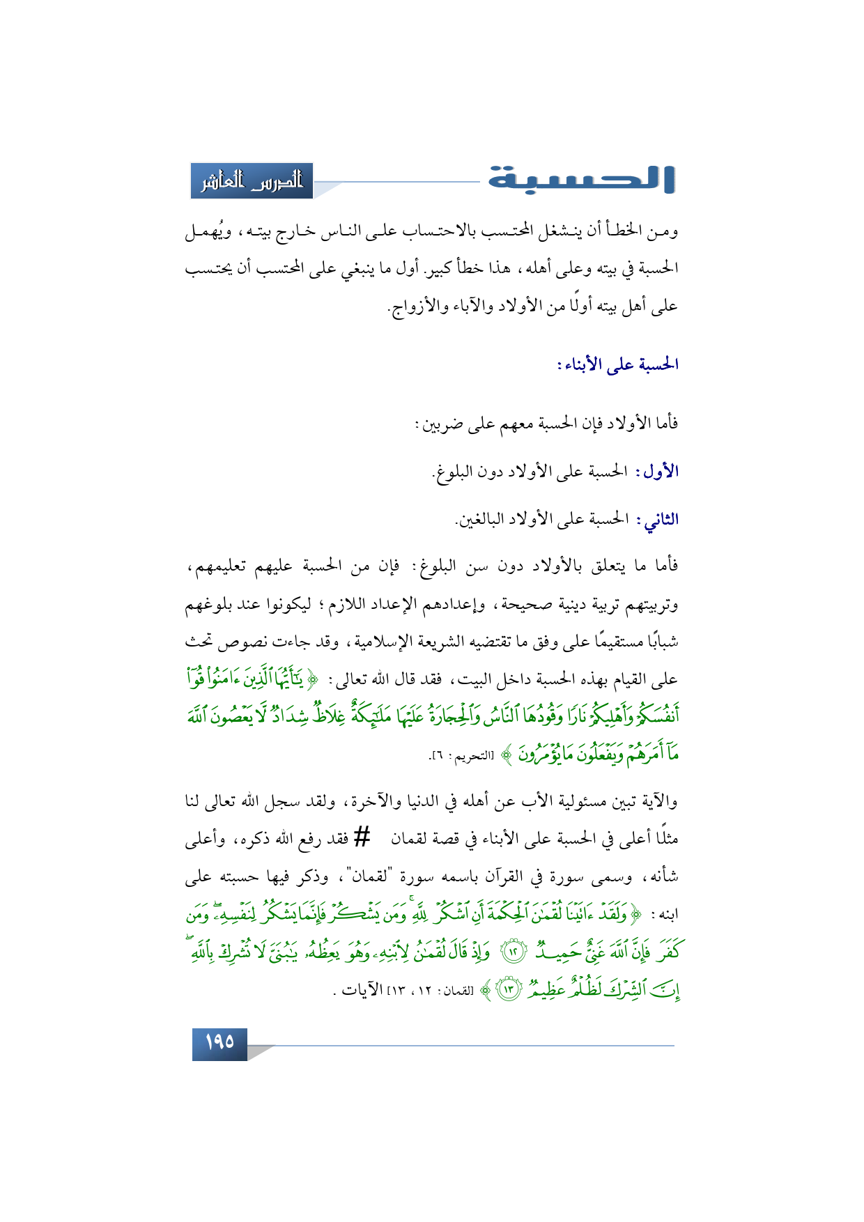 والآية تبين مسئولية الأب عن أهله في الدنيا والآخرة، ولقد سجل الله -تبارك وتعالى- لنا مثل ً اأعلى في الحسبة على الأبناء في قصة لقمان -عليه السلام- فقد رفع الله ذكره، وأعلى شأنه، وسمى سورة في القرآن باسمه سورة "لقمان"، وذكر فيها حسبته على ابنه: {وَلَقَدْ آتَيْنَا لُقْمَانَ الْحِكْمَةَ أَنِ اشْكُرْ لِلَّهِ وَمَنْ يَشْكُرْ فَإِنَّمَا يَشْكُرُ لِنَفْسِهِ وَمَنْ كَفَرَ فَإِنَّ اللَّهَ غَنِيٌّ حَمِيدٌ * وَإِذْ قَالَ لُقْمَانُ لِابْنِهِ وَهُوَ يَعِظُهُ يَا بُنَيَّ لَا تُشْرِكْ بِاللَّهِ إِنَّ الشِّرْكَ لَظُلْمٌ عَظِيمٌ} (لقمان: 12، 13) الآيات.