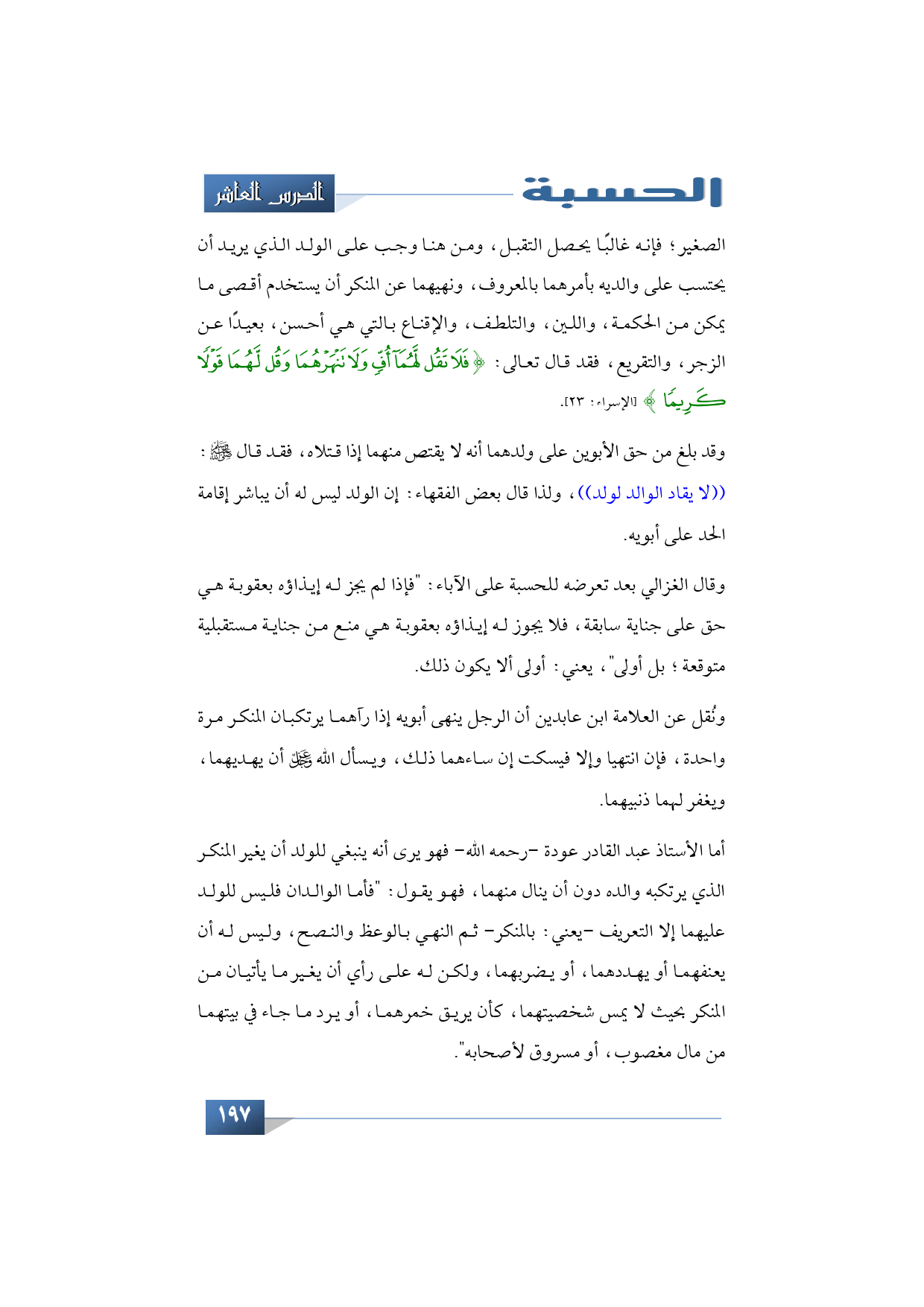 الصغير؛ فإنه غالبًا يحصل التقبل، ومن هنا وجب على الولد الذي يريد أن يحتسب على والديه بأمرهما بالمعروف، ونهيهما عن المنكر أن يستخدم أقصى ما يمكن من الحكمة، واللين، والتلطف، والإقناع بالتي هي أحسن، بعيدًا عن الزجر، والتقريع، فقد قال تعالى: {فَلَا تَقُلْ لَهُمَا أُفٍّ وَلَا تَنْهَرْهُمَا وَقُلْ لَهُمَا قَوْلًا كَرِيمًا} (الإسراء: 23).